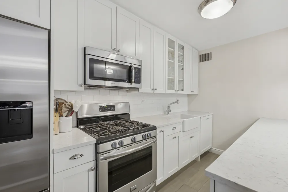 The entry foyer has a large coat closet and walk-in closet, and opens up to a spacious living area and dining area. The gorgeous open kitchen features white stone countertops, white subway tile backsplash, farmhouse sink, white shaker cabinets, breakfast bar, and stainless steel appliances. Just off of the living area, a hallway with two additional closets leads to the bathroom and king size bedroom. The second bedroom is a great space with additional closets, and can also be used as a den or office. Updated bathroom, custom lighting, hardwood floors throughout, through the wall AC, and generous storage.