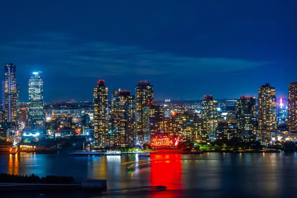 The extraordinary primary bedroom suite faces south and west and has mesmerizing views of the iconic Manhattan skyline inclusive of the Chrysler and Empire State Buildings. The Suite has an incredible dressing room that is 18" feet long in addition to the separate walk-in closet. The glamorous, windowed en-suite primary bath is clad in white Sivec marble with a Foster and Partners custom-designed Poliform teak vanity. It has radiant heated floors, dual sinks, a deep soaking tub with striking views, an oversized walk-in glass enclosed shower and a separate water closet with bidet.