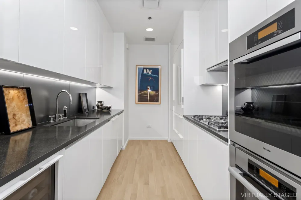 The kitchen features custom-designed Poliform white lacquer cabinetry, honed absolute Granite countertops and is equipped with top-of- the-line appliances. These include a Subzero refrigerator with two freezer drawers, a Subzero wine refrigerator, Miele oven with five burner range, microwave/convection oven, warming drawer and dishwasher. There is also a laundry area with a Miele washer and dryer.