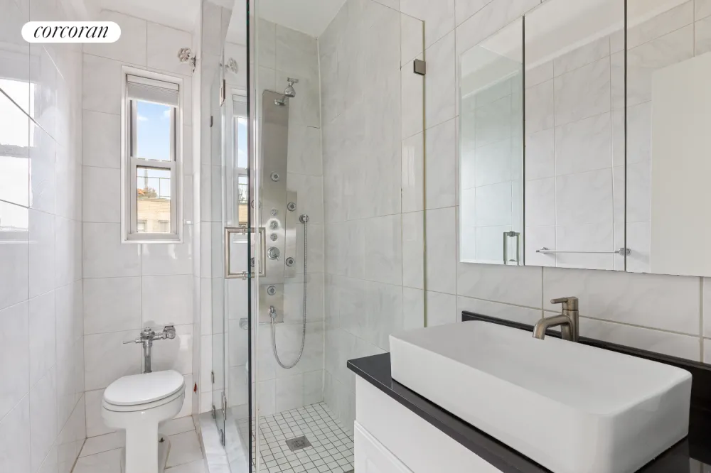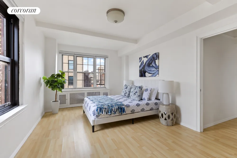 Down the hall, a generous walk-in closet provides excellent storage before entering the serene corner bedroom, which enjoys both north and west exposures with a view toward Lower Manhattan. The en-suite bathroom has modern finishes and a linen closet adds even more function.