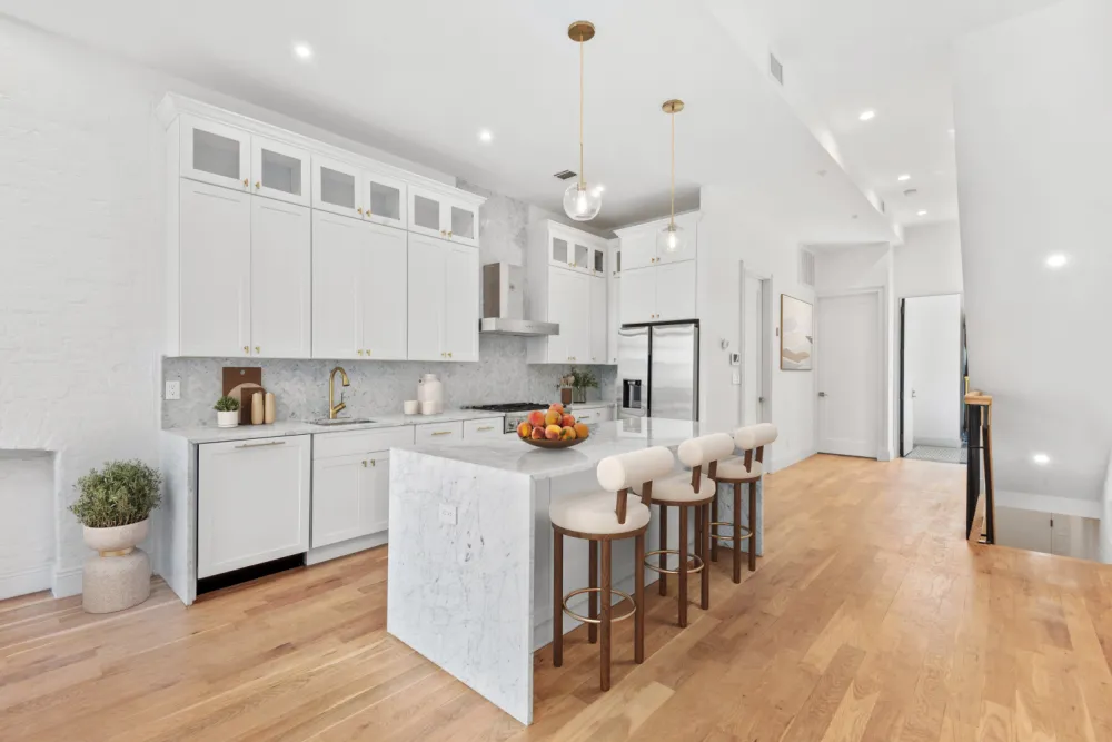 Tucked within a stately Harlem brownstone on a storied landmarked, tree-lined street, this 2,400-square-foot triplex sanctuary blends timeless beauty with modern sophistication. Sunlight pours through south-facing Pella architectural windows, illuminating oak floors that flow throughout the space. The home features three serene bedrooms that offer a tranquil retreat, complemented by 3.5 artfully designed bathrooms showcasing thoughtful aesthetics and modern elegance. A custom iron entry door welcomes you home, where 11.5 foot ceilings and Italian marble countertops shimmer in a bespoke kitchen fitted with sleek custom cabinetry, a dishwasher, and a Bertazzoni stove, ready to inspire culinary dreams. The primary suite is a haven unto itself, with a walk-in closet and a spa-like shower featuring a double vanity, perfect for quiet moments of reflection. Central HVAC with Google Nest thermostats ensures year-round comfort, and a washer/dryer adds convenience.