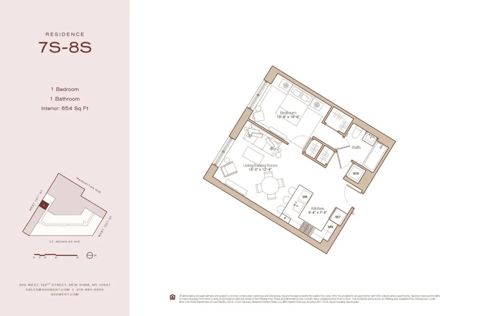Introducing residence 7S at 300 West, a southern-facing one bedroom, one bathroom, offering a spacious living/dining area that boasts custom White Oak herringbone flooring, central heating and air conditioning, and insulated oversized windows. The living area opens to a full custom kitchen designed by Paris Forino, complete with White Oak cabinetry and Carrara marble countertops and backsplash featuring plenty of dining space. This unique kitchen features a Sub-Zero refrigerator, Wolf oven and gas range, and Cove dishwasher. Each apartment is equipped with a washer/dryer hook-up for your convenience.