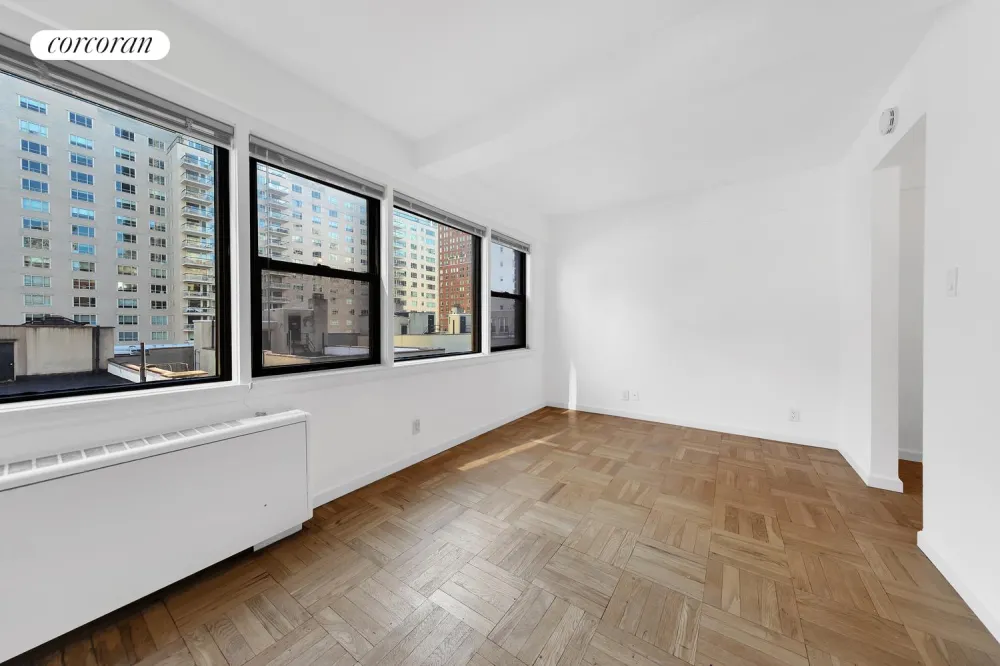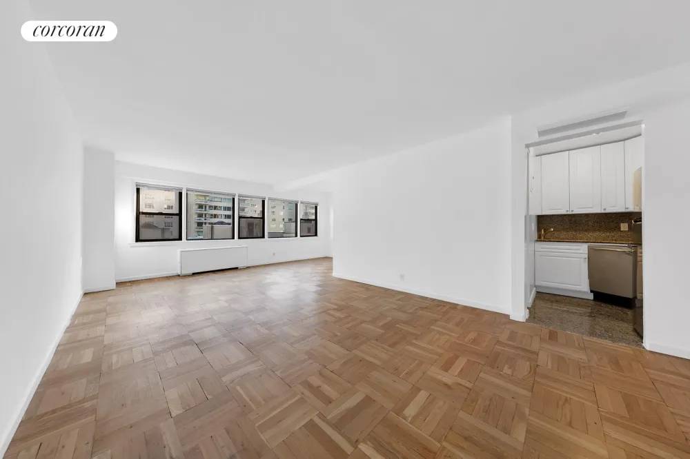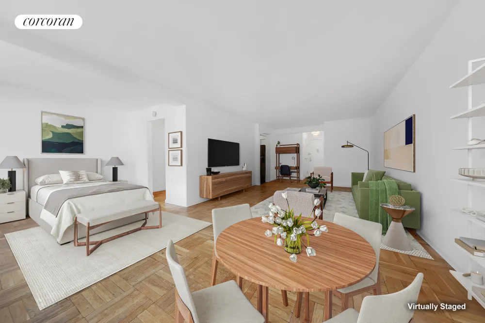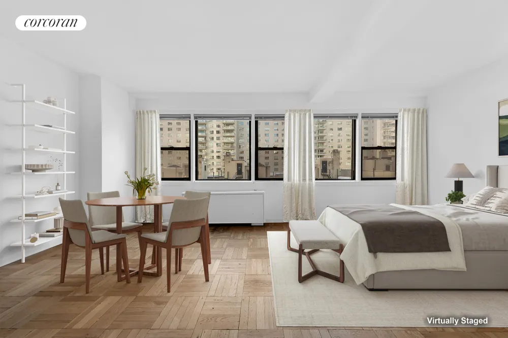 This bright and airy high-floor alcove studio features expansive, unobstructed Southern views and a spacious, loft-like layout that can easily be converted into a junior one-bedroom. The renovated kitchen is equipped with stainless steel appliances, including a dishwasher and microwave, and the modern marble bathroom adds a touch of luxury.