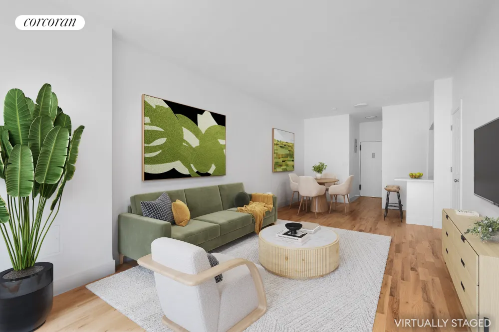 The expansive living room offers distinct areas for lounging, dining, and a home office all punctuated by a wall of south facing windows through which is your private garden. The kitchen boasts stainless steel appliances, dishwasher, quartz countertops, white subway tile backsplash and a breakfast bar.