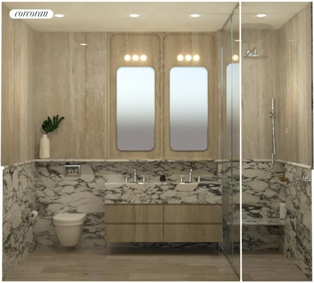 Primary baths feature marble-wrapped showers, radiant heated flooring, custom floating vanities with ample storage, large medicine cabinets, and wall-mounted toilets. The secondary baths each have soaking tubs, marble flooring, and large floating vanities topped with marble.