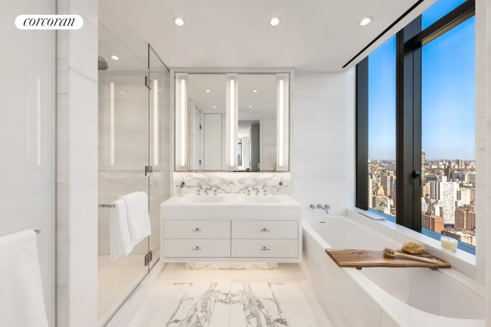The north-facing primary bedroom boasts ample closet space, an en-suite bathroom elegantly ornamented with Bianco Dolomiti and Calacatta Gold marble, Toto Neorest water closets, and a soaking tub. The secondary bathrooms are embellished with Italian custom-crafted lacquer wood vanities, honed cloudy mist marble floors and shower walls, glacier white Corian countertops with integral sinks, and Duravit water closets. Waterworks fixtures are throughout. Residence features include 5 solid oak plank quartered and rifted flooring, 4 pipe HVAC for year-round climate control.