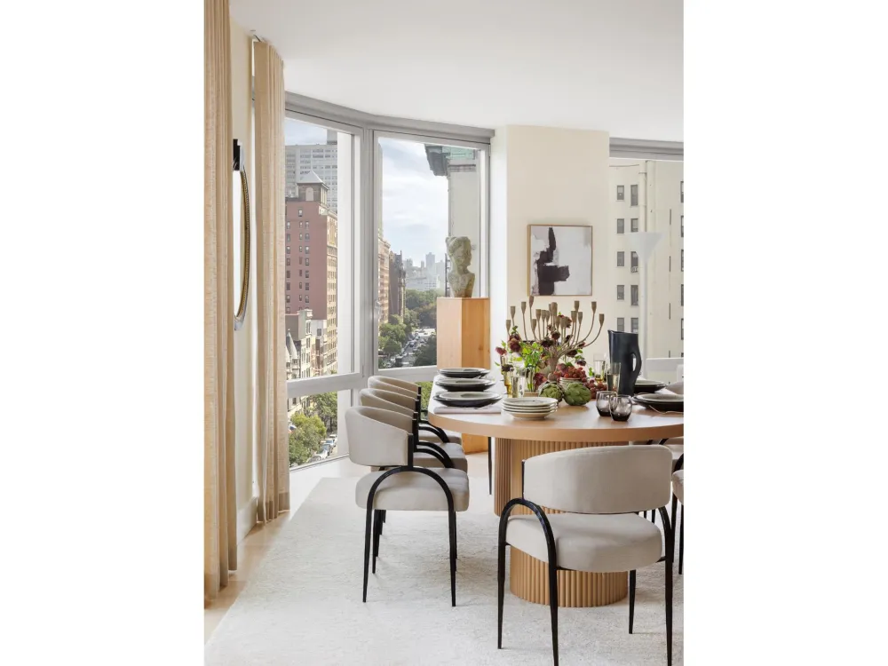 The custom CetraRuddy-designed open kitchen is outfitted with white matte lacquer cabinetry, honed quartzite slab countertop and backsplash, and a full suite of Miele appliances. The oversized kitchen island features a quartzite countertop and waterfall edge that provides ample seating space.
