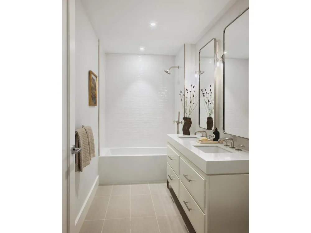 This gracious, corner 2,082 square-foot, 4-bedroom, 3-and-a-half-bathroom home opens onto 5" plank white oak flooring bathed in natural light from oversized east-facing windows. The spacious corner great room is ideal for entertaining or relaxing and includes a separate dining area and built-in cabinetry for a television or artwork.