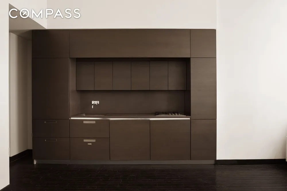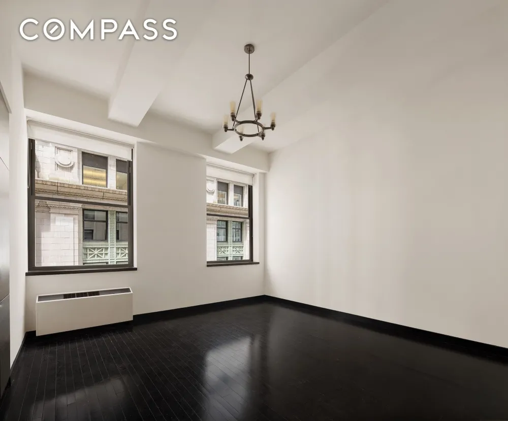 With soaring 12-foot beamed ceilings and rich ebony-stained hardwood floors, this flex one-bedroom exudes dramatic scale and refined warmth. The open-concept layout offers an ideal flow for both everyday living and entertaining.