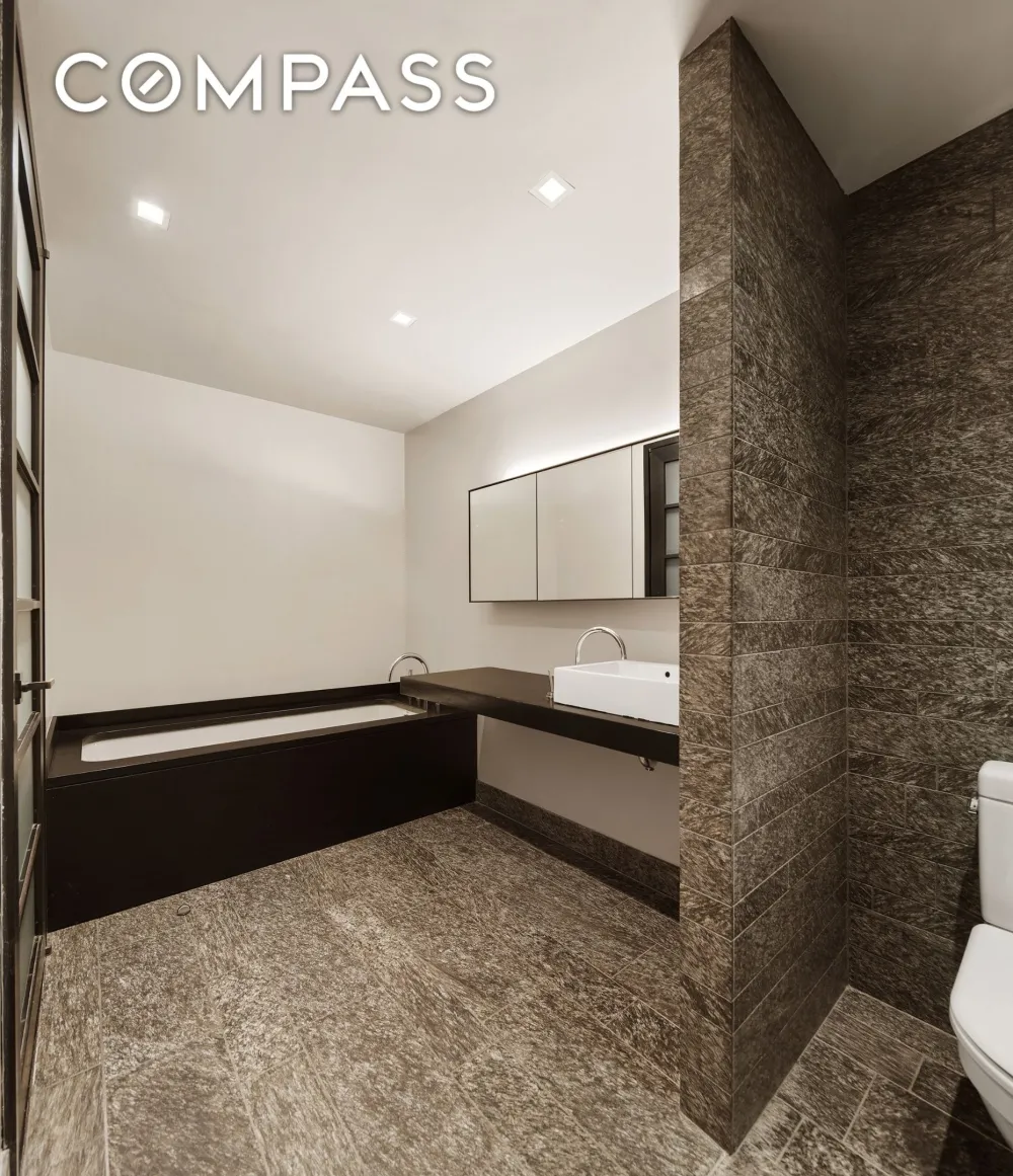 Retreat to the oversized spa-inspired bathroom, wrapped in imported stone and featuring a deep soaking tub, separate recessed rain shower, and luxury fixtures — your own personal sanctuary.