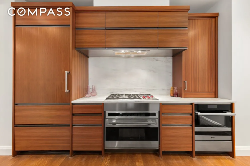 The 30-foot loft-style living room with soaring 10-foot ceilings and floor-to-ceiling windows creates a dramatic yet welcoming space, perfect for both entertaining and everyday living. The open-concept kitchen is a showpiece for culinary enthusiasts, outfitted with Alabama white marble, LeFroy Brooks fixtures, a wine fridge, and premium appliances by Miele, Wolf, and Sub-Zero.