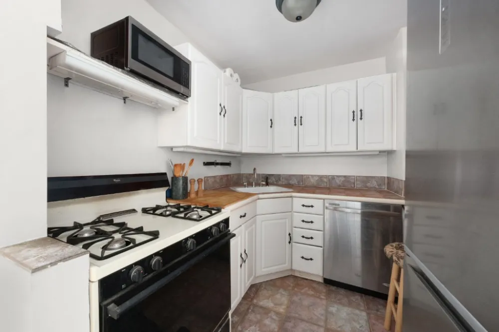 The kitchen is well-equipped with full-size appliances and ample cabinet storage, while the bathroom boasts a clean and classic design. Hardwood floors, plentiful closets, and a practical layout enhance the apartments sense of space and comfort.