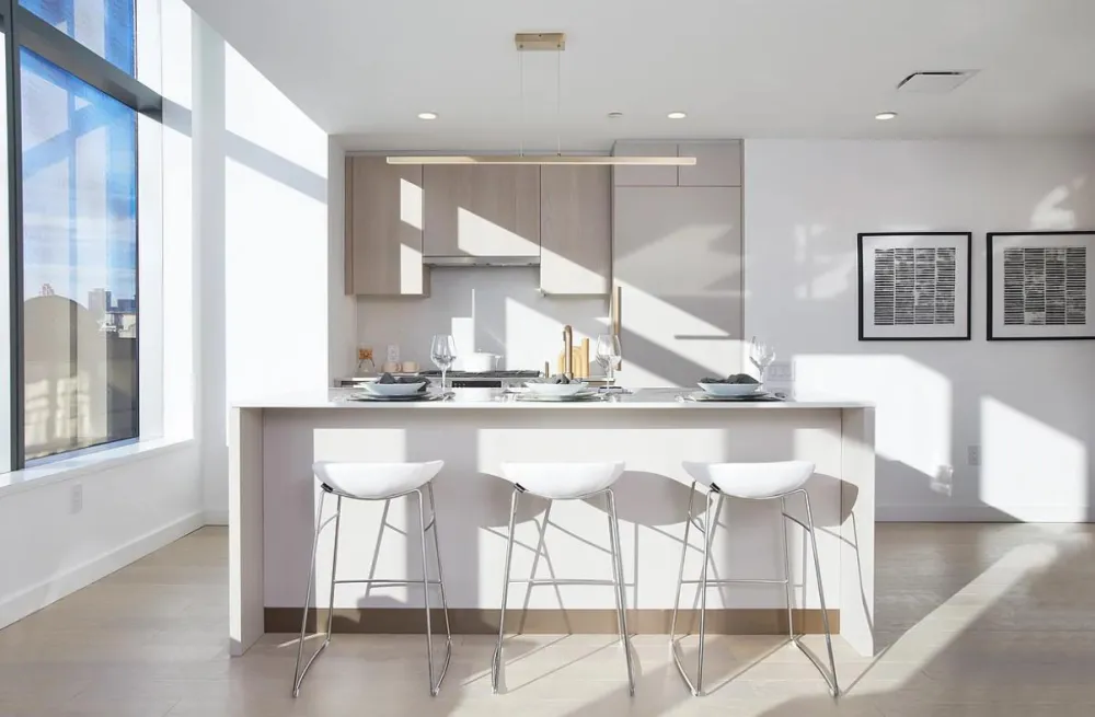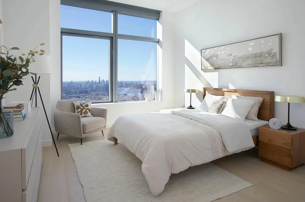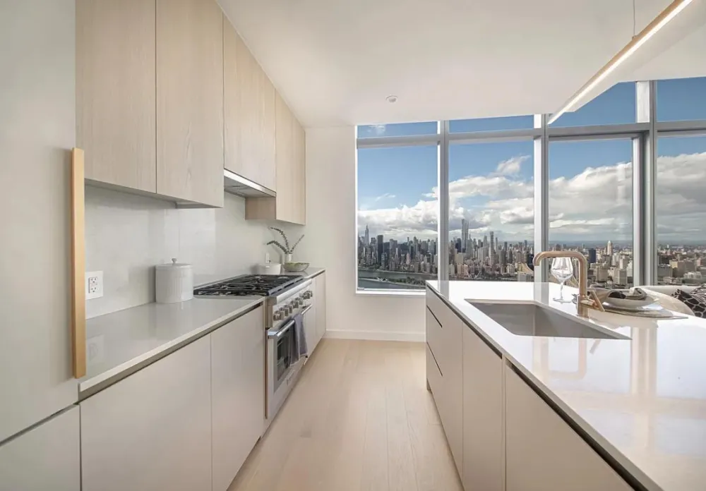 The high floor direct west facing two bedroom is an impressive residence with a jaw-dropping view of the Manhattan skyline. It features distinctive European white oak engineered wood flooring throughout and a side by side bedroom layout; the spacious master bedroom has a walk-in closet. The contemporary, beautifully designed island kitchen is ideal for entertaining. It is composed with cabinetry finished with sand ash veneer and extreme matte laminate, a Viatra quartz slab countertop and backsplash, top-of-the-line Bosch appliance package that includes an outside venting range hood, and Monogram microwave.
