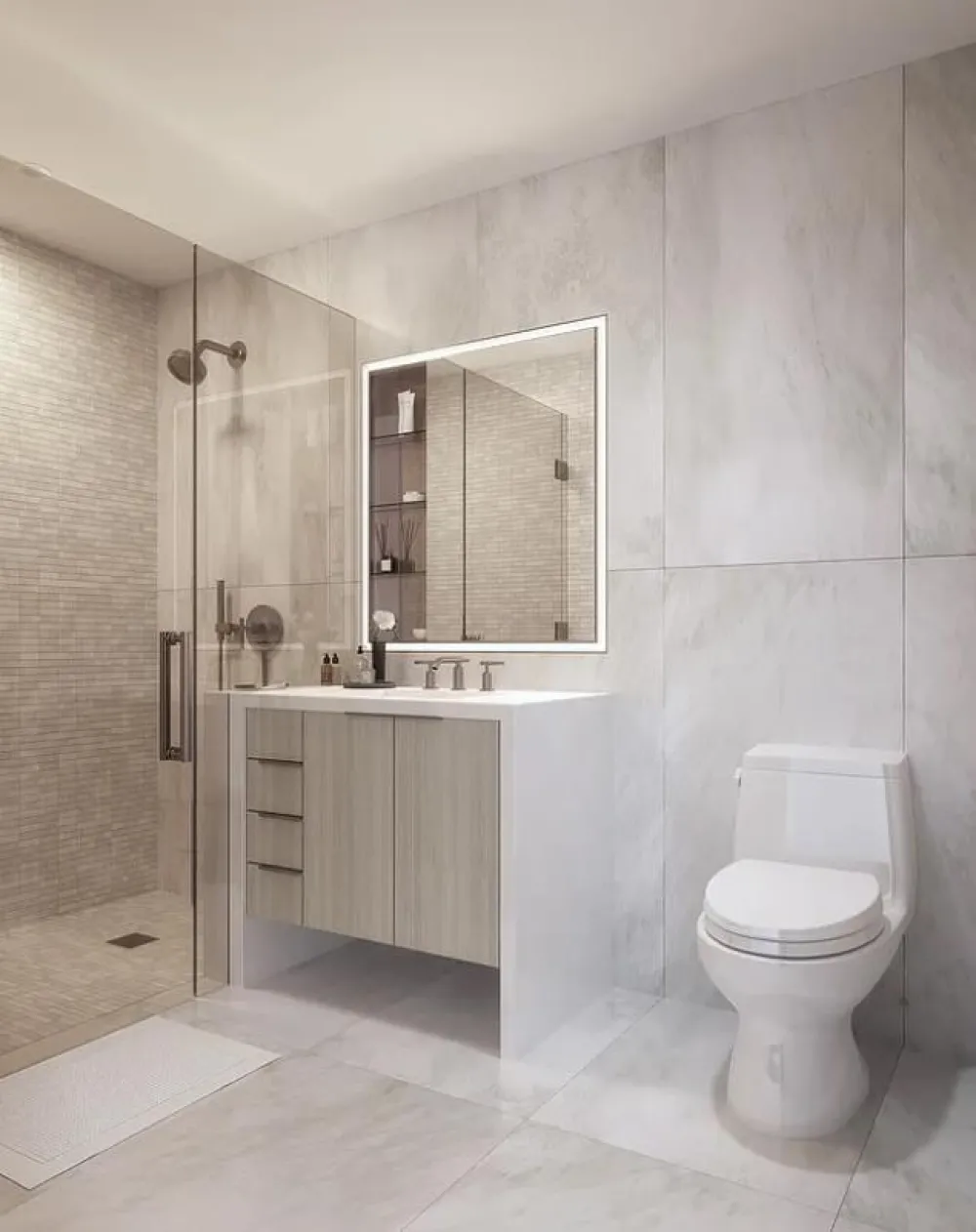 Your spa-inspired master bathroom is a luxurious private enclave lined in porcelain tile. Sophisticated finishes include sand ash veneer and a white quartz vanity, enhanced by a frameless glass shower with light bronze Kohler Purist shower set, a custom recessed medicine cabinet with light bronze frame, with open glass shelving, all surrounded by integrated light. Elegant light bronze Kohler Purist fixtures and accessories, a Kohler Verticyl undermount sink and Toto Eco Supreme one-piece toilet complete this luxe bathroom.