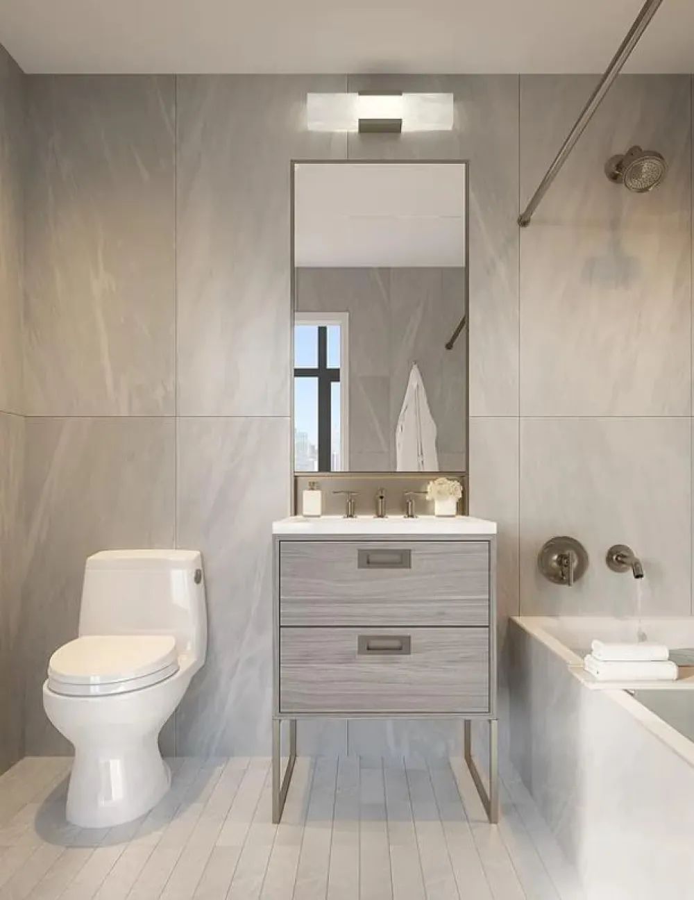 The secondary bathroom is equally luxurious. High-end finishes include grey ash veneer and an iceberg white marble vanity, complemented by a decorative wall sconce. It is equipped with elegant light bronze Kohler Purist fixtures and accessories throughout, a custom recessed medicine cabinet with bronze frame and alcove, luxurious Kohler Underscore tub, Kohler Verticyl undermount sink and Toto Eco Supreme one-piece toilet.