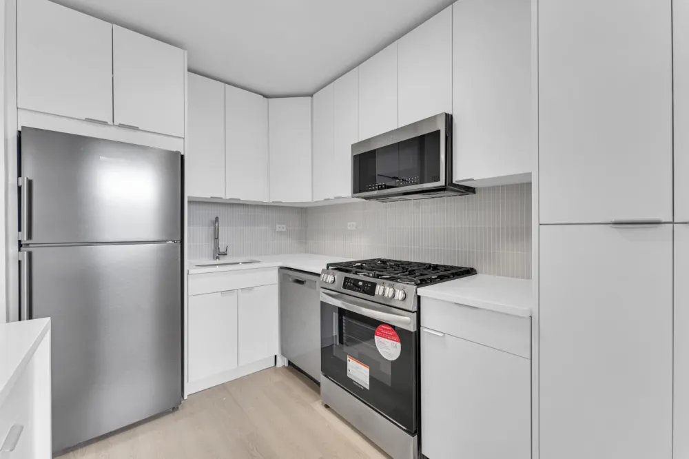 Modern Kitchen: Designed for both style and functionality, the kitchen showcases quartz countertops, sleek white cabinetry, a tile backsplash, and brand-new stainless steel appliances, including a gas range, microwave, dishwasher, and refrigerator.