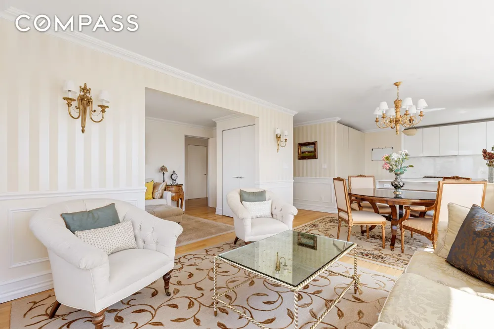 Bathed in natural light, the apartment faces south and west, offering breathtaking views of the Hudson River and Manhattan skyline. Thoughtful upgrades include detailed crown moldings, custom wall paneling, built-in cabinetry, and rich finishes throughout.