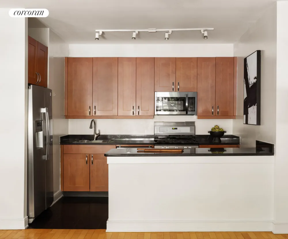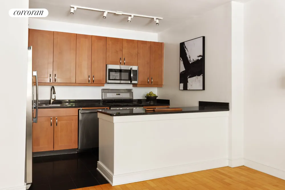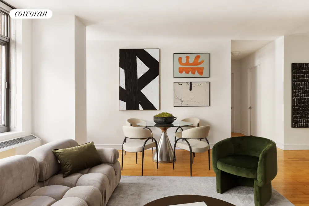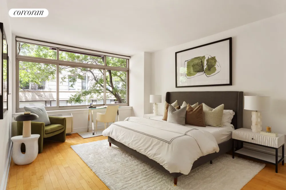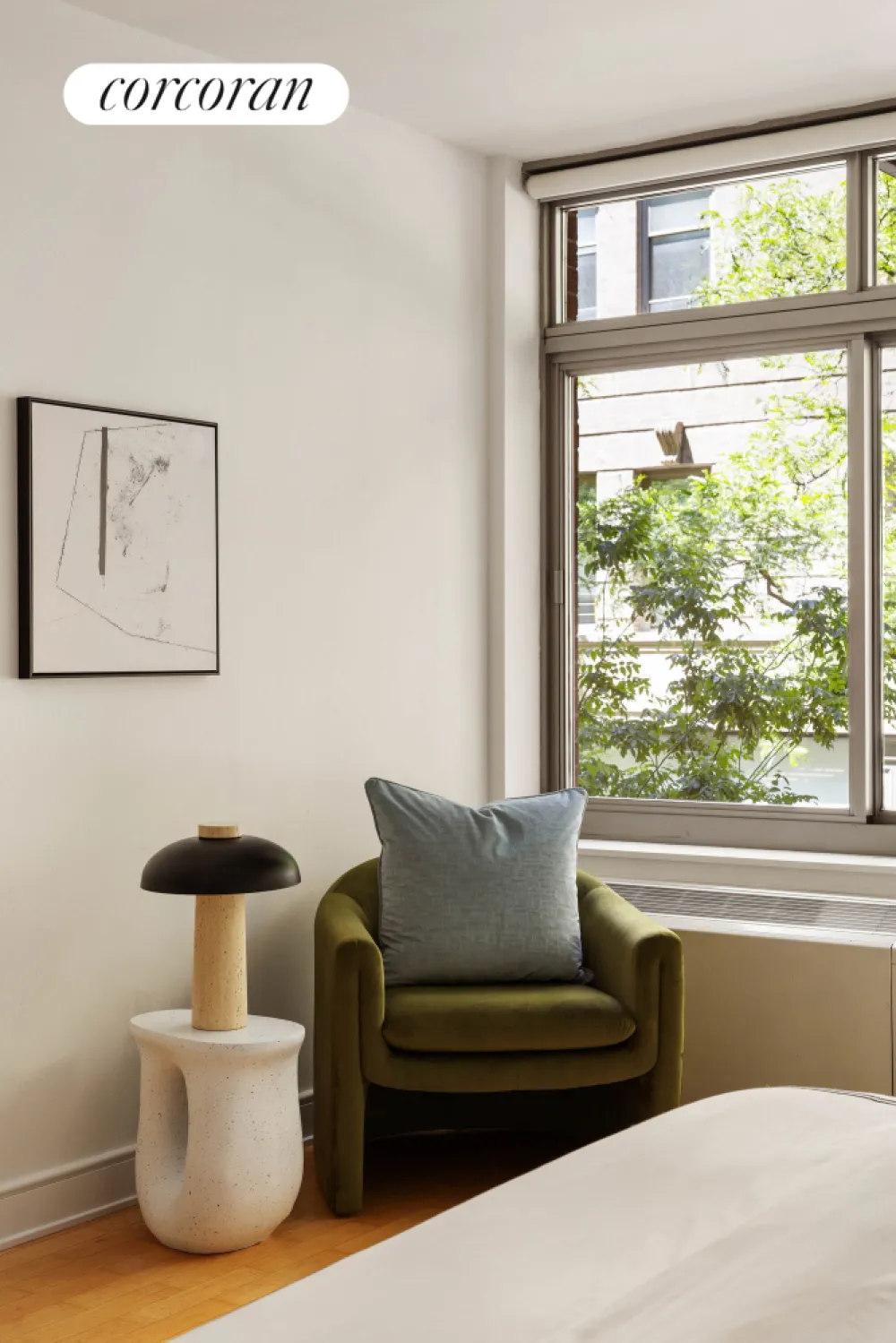 Upon entry, you're greeted by oversized windows overlooking quiet, tree-lined Horatio Street with greenery everywhere you look. Before entering the north-facing great room bathed in soft natural light you'll find an oversized coat closet and a full sized vented washer and dryer for added convenience. The living and dining areas feature hardwood floors, a wall of windows, and lofty ceiling heights and provide an extra wide entertaining space offering plenty of layout options. This includes a windowed nook perfect for a home office or your afternoon reading.