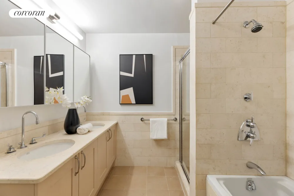 The second bedroom, which comfortably fits a queen and is also perfect for a home office or a nursery, has a large reach-in closet, electronic blinds, and a wall of windows. Across the hall is a renovated guest bathroom complete with a vanity with under-counter storage, New York style subway tile, and a soaking tub.