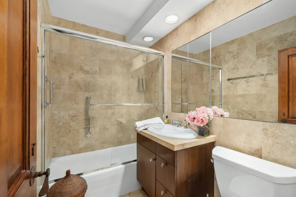 The south facing primary bedroom is tranquil and private featuring an ensuite marble bath and two walk-in closets. The 2nd bedroom with full marble bath and 3rd bedroom/library with full marble bath and walk-in closet complete the home.