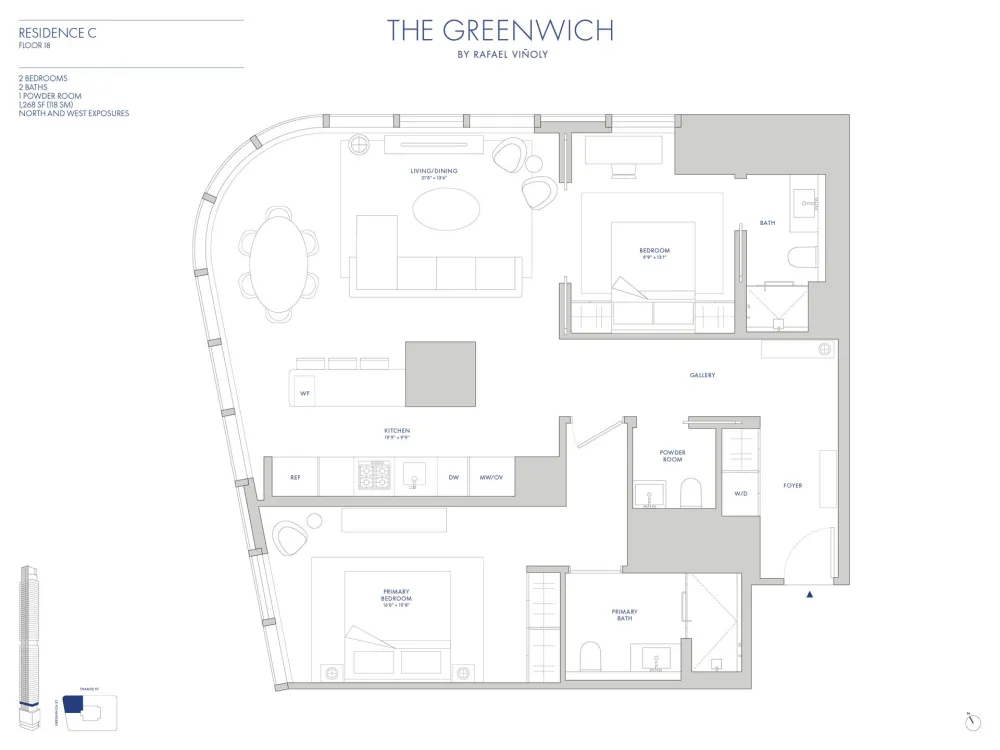 The complete offering terms are in an offering plan available from Sponsor. Sponsor: 125 Greenwich Owner LLC c/o: Fortress Investment Group LLC, 1345 Avenue of the Americas, 45th Floor New York, NY 10105. File no. CD15-0336. The artist representations and interior decorations, finishes, appliances and furnishings are provided for illustrative purposes only. All residential units are sold unfurnished. Sponsor makes no representations or warranties except as may be set forth in the offering plan. Sponsor reserves the right to substitute materials, appliances, equipment, fixtures and other construction and design details specified herein with similar materials, appliances, equipment and/or fixtures of substantially equal or better quality. All dimensions are approximate and subject to normal construction variances and tolerances. Square footage exceeds the usable floor area. Sponsor reserves the right to make changes in accordance with the terms of the offering plan. Plans and dimensions may contain minor variations from floor to floor. All dimensions and ceiling heights are approximate. Equal housing opportunity.