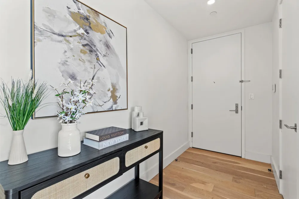 A lovely foyer with a deep coat closet leads into an inviting open-concept living, dining, and kitchen area adorned with fumed oak wide plank floors, high ceilings, and floor-to-ceiling windows. The living space receives abundant northwestern light and flows out to a large private terrace for entertaining, alfresco dining, and a seamless indoor-outdoor experience.