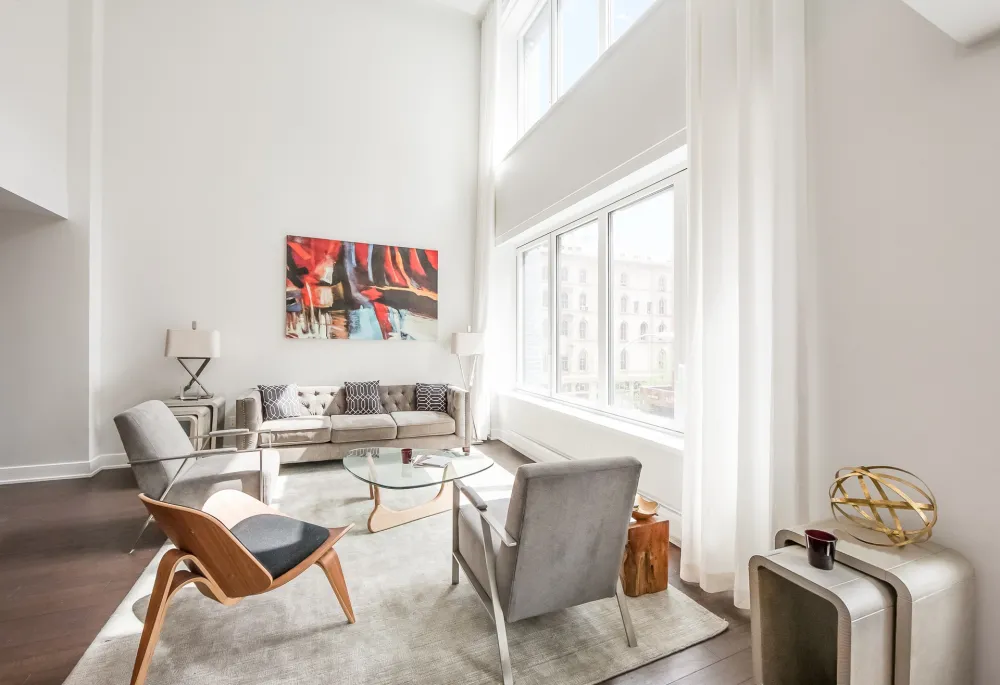 Residence 3/4-BC at 5 Franklin Place is a 2,456-square-foot duplex loft located in one of Tribeca’s newer full-service buildings. Tucked away on a quiet, private alley just north of Franklin Street, this residence offers a distinctive layout, impressive ceiling heights, and a clean, modern design. Upon entering through a private foyer, you're welcomed into a striking double-height living area with oversized East-facing windows that bring in abundant natural light and offer open views over Tribeca. The layout includes four well-defined rooms, finished with 5-inch wide-plank oak flooring and generous built-in and private storage, including a dedicated storage unit. The open kitchen is outfitted with double Poggenpohl cabinetry, two integrated Sub-Zero refrigerators, a Bosch gas range, wine fridge, and dishwasher. It's designed for both everyday functionality and easy entertaining. On the upper level, the primary bedroom features a large walk-in closet and a spacious en-suite bath with a deep soaking tub, separate shower, and double vanity. Adjacent to the bedroom is a versatile room that can serve as a home office, studio, or fitness space. All bathrooms are finished with hand-laid imported marble and Waterworks fixtures, offering a refined and consistent aesthetic throughout the home. 5 Franklin Place was designed by ODA Architects with interiors by Andre´s Escobar and offers a strong suite of amenities, including a 24-hour concierge and doorman, landscaped roof deck with pool and cabanas, a gym, children’s playroom, bicycle storage, and a live-in superintendent. ** A deeded parking space is also available for purchase. **DISCLAIMER: THE BEDROOMS ARE INTERIOR ** * This is a rare opportunity to own a thoughtfully designed duplex in the heart of Tribeca, combining architectural distinction with everyday comfort and convenience.