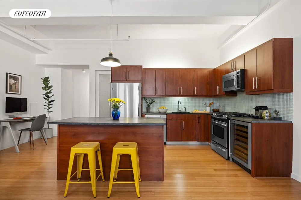 1. A massive corner chef's loft kitchen replete with a large island, tons of stone countertops, Bosch and GE steel appliances, a wine fridge, and a decorative backsplash.