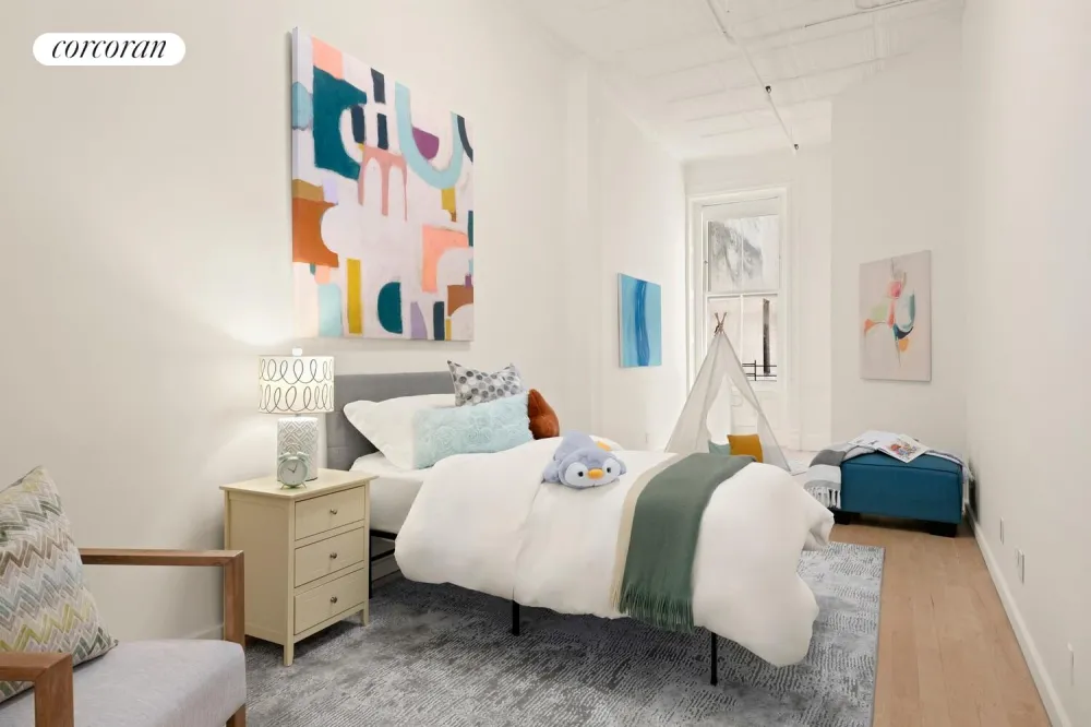 This two-bedroom, two-bath residence in a boutique co-op combines modern elegance with historic architectural charm, offering expansive open-concept living and abundant natural light across its full-floor layout. The private key-locked elevator opens directly into a semi-private vestibule and then into an airy living space framed by oversized east-facing windows that capture architecturally stunning views of neighboring buildings. 12-foot ceilings with original pressed-tin details and immaculate finishes throughout make this home a standout among downtown Manhattan lofts. The custom Pedini Artika kitchen is a true statement piece - featuring sleek white laminate cabinetry, a one-of-a-kind curved design, Liebherr and Bosch appliances, a five-burner cooktop, and a comfortable breakfast bar, perfect for entertaining. The generous great room accommodates a large dining area, living space, and home office setup while showcasing stunning gallery-style proportions for large-scale artwork.
