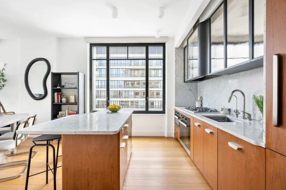 The kitchen is outfitted with Miele appliances, custom walnut cabinetry designed by Molteni&C including polished metal trim and fluted mirror accents, and beautiful Carrara marble traveling along the counters and back-splash. A spacious island rounds off the luxurious kitchen with a Carrara marble top to match.