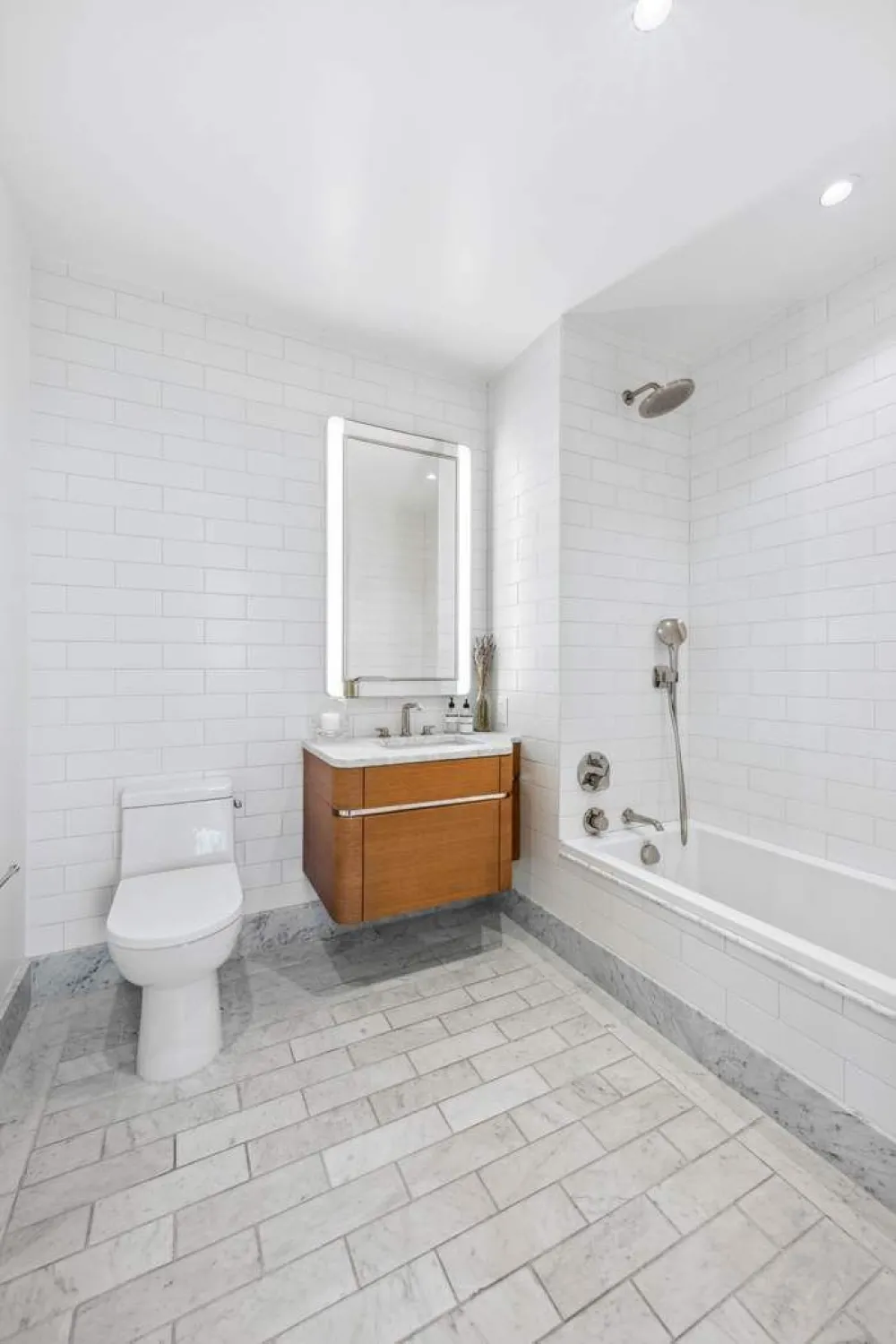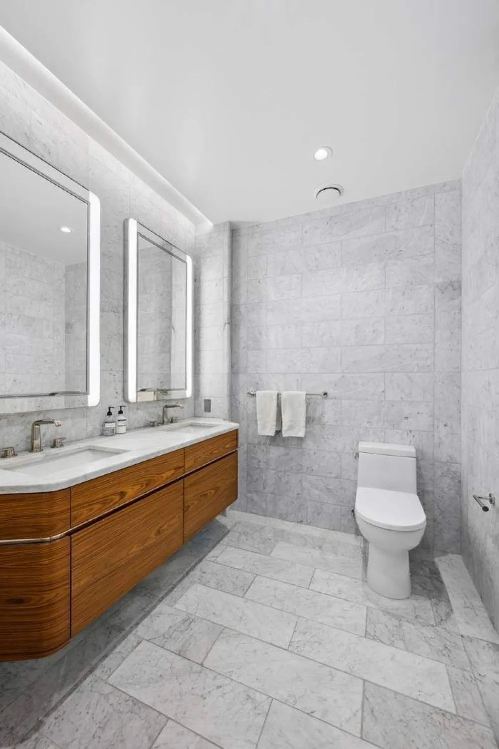The primary suite is cleverly positioned and set apart from the main entertaining spaces offering both privacy and tranquility. This bedroom easily accommodates a king-sized bed with an abundance of closet space and open sky and city views. You will also enjoy a handsome en-suite bathroom adorned in floor to ceiling marble, polished nickel fixtures, engineered rosewood double vanity, and a tall standing shower.
