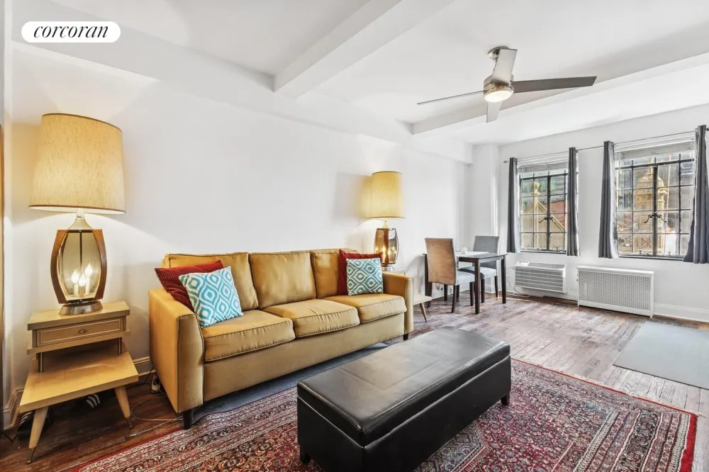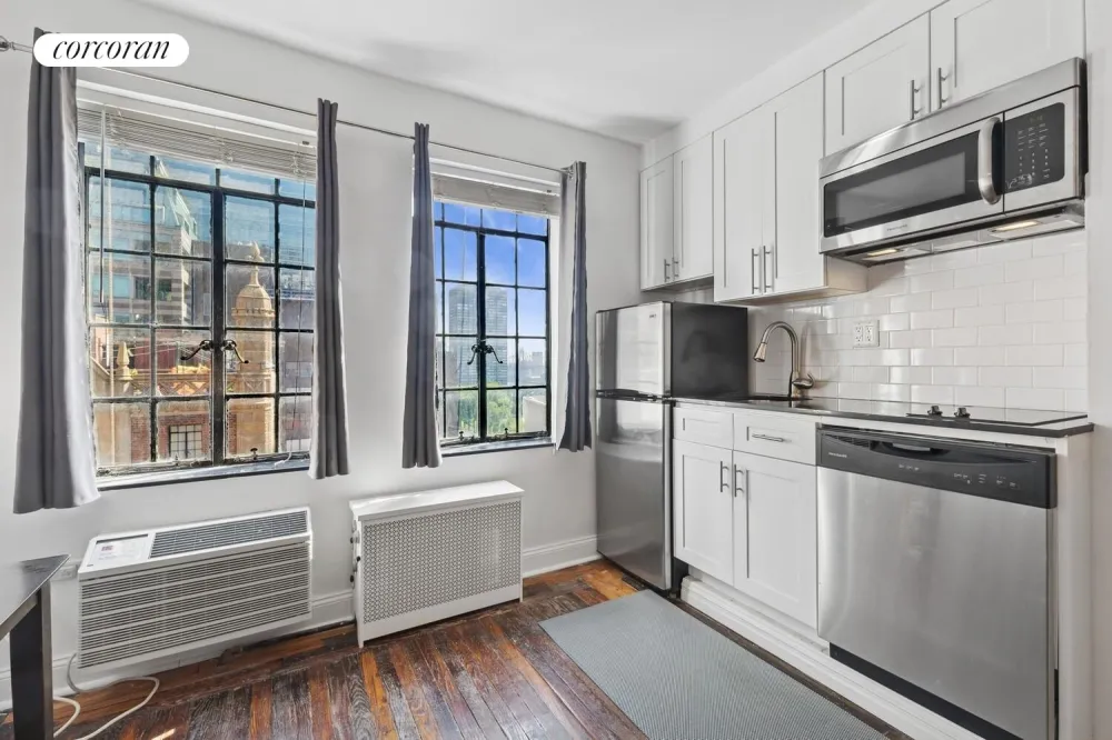 A serene, sun-filled studio in one of Manhattan's most iconic and historic neighborhoods. This thoughtfully designed home features original hardwood floors, three (3) generous closets, and a rare through-the-wall A/C unit. The kitchen is outfitted with a full-size refrigerator, dishwasher, and ample cabinet space - a unique offering for studio living. High, beamed ceilings and casement windows add to the classic Tudor charm while bringing in great natural light.