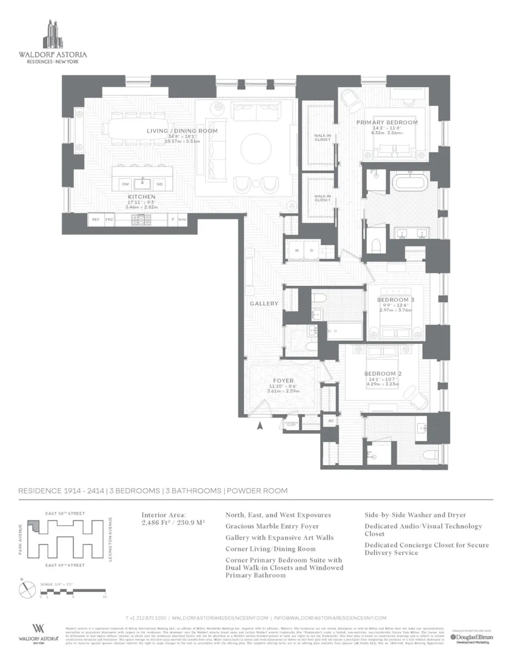 Own a piece of the legacy at Waldorf Astoria Residences New York. Residence 1914 is situated on the corner of 50th Street, facing north and west, and offers stunning views of Park Avenue. Designed by internationally acclaimed designer Jean-Louis Deniot, residences combine modern comfort with signature features such as a dedicated Concierge Closet and keyless entry with opulent details like ceiling coves, herringbone floors, oversized custom-paneled doors, spacious walk-in closets, and grand entry foyers with marble floors and brass inlays .