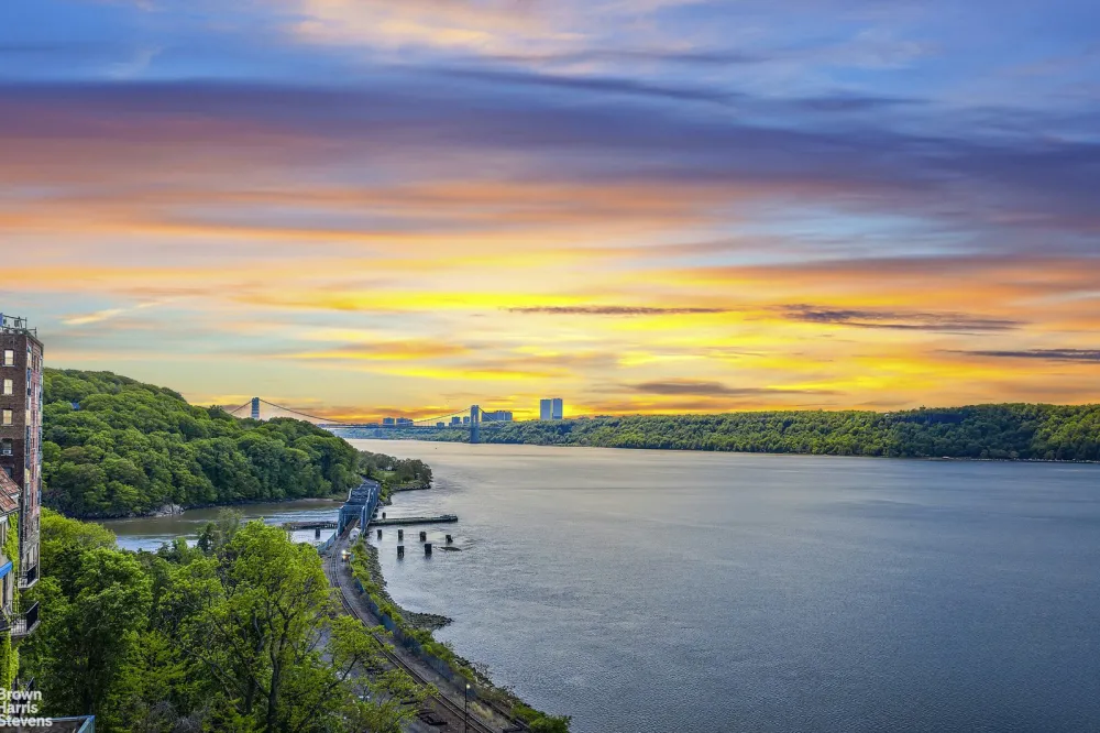 From the moment you enter, you're greeted by classic black-and-white marble floors, custom crown and base moldings, and perfectly plastered walls illuminated by elegant cove lighting-all setting the tone for the luxurious lifestyle that awaits. The spacious living room features brand-new hardwood floors and floor-to-ceiling windows that showcase unobstructed views of nature's finest. Watch sunsets dance across the Hudson and the Palisades, and enjoy the nightly glow of the GW Bridge-all from the comfort of your home.