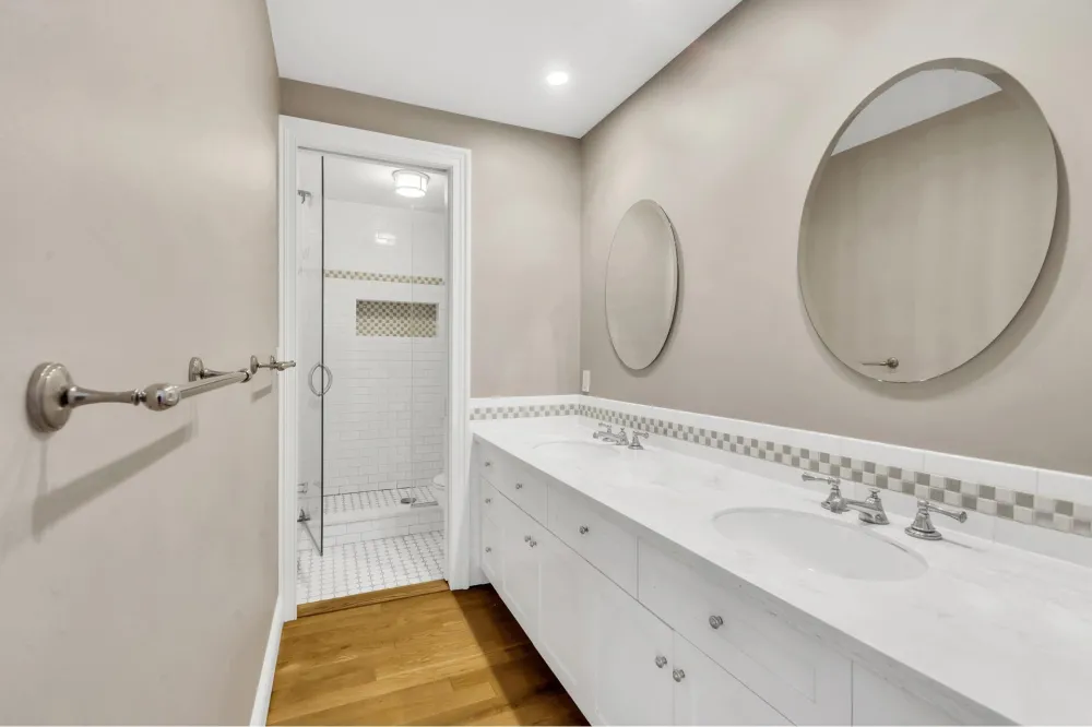 The primary suite overlooks a tranquil side street and features two large custom closets and a beautifully appointed en-suite bath with dual sinks. The second bedroom, located on the opposite side of the home for added privacy, is served by a full bathroom with stone countertops and a soaking tub.