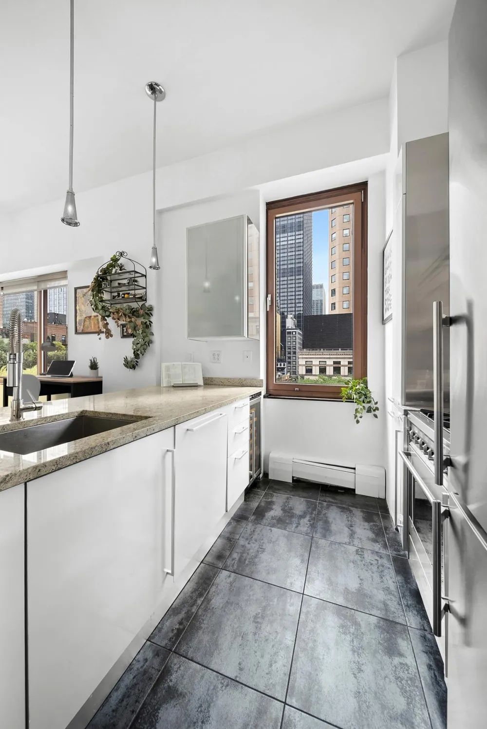 The expansive living area spans over 23 feet in length, offering a true loft-like atmosphere with high ceilings and dramatic windows that wrap the corner, creating an open and luminous environment. The adjacent chef’s kitchen is accented by a tall window that overlooks tree-lined greenery—bringing warmth and a touch of nature indoors.