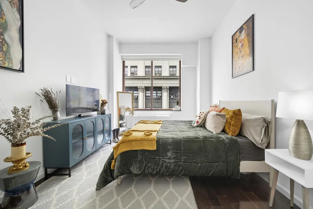 The king-sized bedroom, nearly 17 feet long, is peacefully situated on a quiet side street and offers generous space for additional furnishings or a work-from-home setup. The entire apartment has been fully renovated with care, featuring wide-plank floors, a sleek modern bathroom, premium appliances, and bespoke cabinetry throughout.