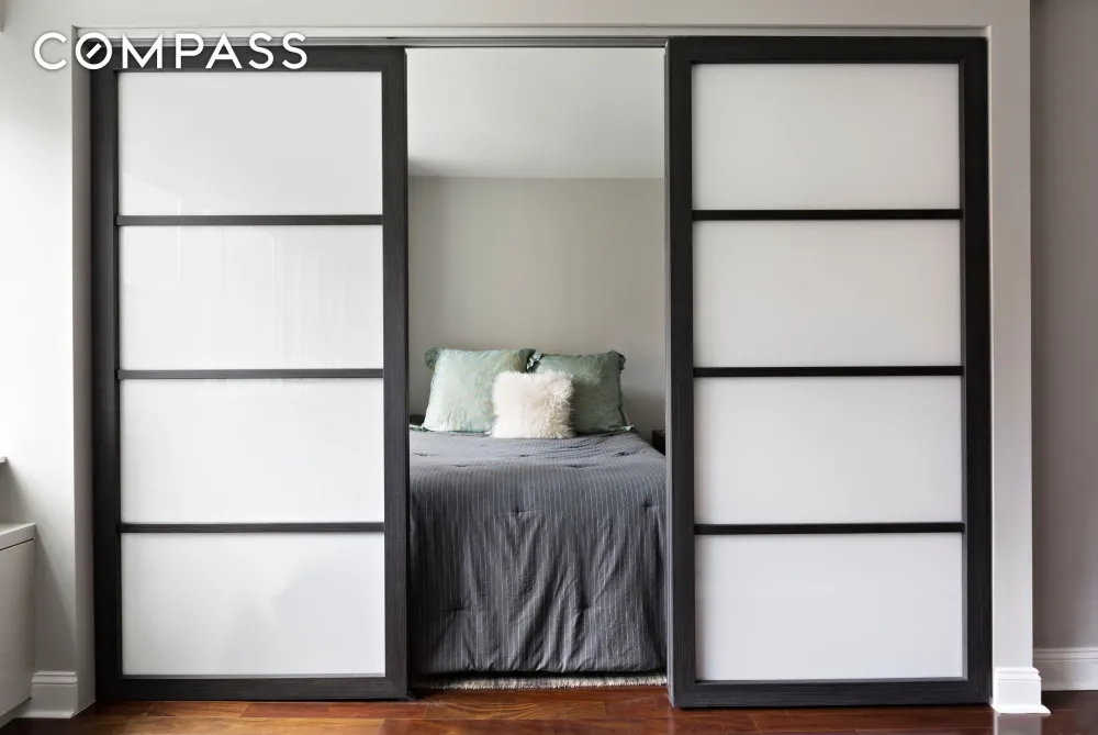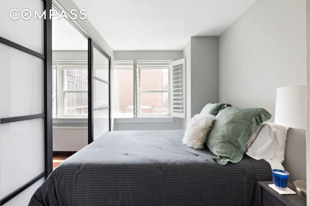 Welcome to Apartment 6L at The John Adams — a beautifully renovated junior one-bedroom in one of Greenwich Village’s most coveted full-service co-ops. This thoughtfully designed home boasts a sprawling 27-foot living and dining area, ideal for entertaining or relaxing in style. The spacious alcove has been smartly converted into a private sleeping area, separated by custom frosted sliding doors, and comfortably fits a queen-sized bed. Eastern exposure floods the home with natural light through oversized, double-pane windows, while wide-slat plantation shutters provide the option for complete privacy and darkness when desired.