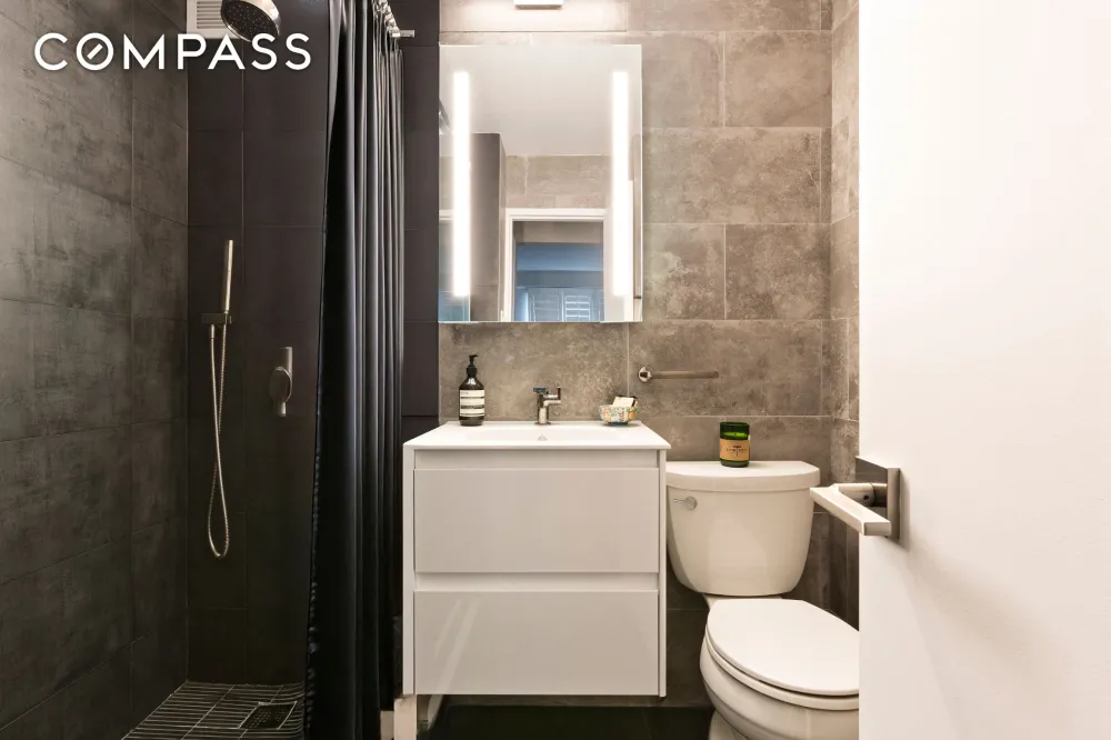 The renovated kitchen is a dream for any home chef, featuring full-size stainless steel appliances including a gas range and dishwasher, elegant two-tone cabinetry with under-cabinet lighting, quartz countertops, and a modern herringbone tile floor. The windowed bathroom is equally impressive with its oversized slate-toned tile, illuminated vanity mirror, and contemporary fixtures. Rich Brazilian cherry hardwood floors run throughout the apartment, adding warmth and sophistication, while generous closet space provides practical storage. Monthly maintenance includes gas and A/C.
