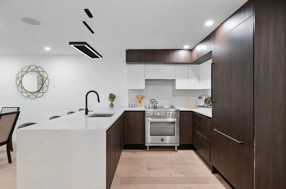 The kitchen features an eat-in waterfall peninsula, gleaming Marigold Quartz countertops and backsplash, custom walnut cabinetry from Scavolini, an Artos faucet, and integrated high-end Bertazzoni appliances including a state-of-the-art, eco-friendly induction range.