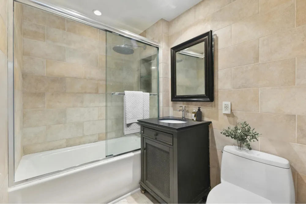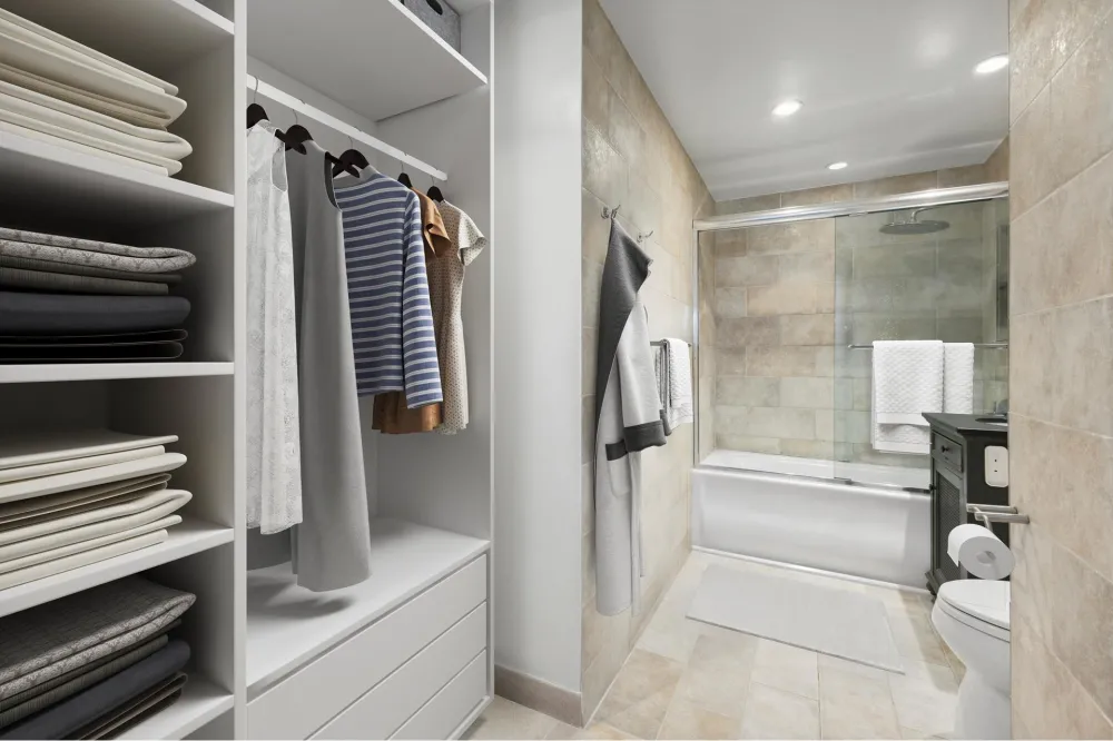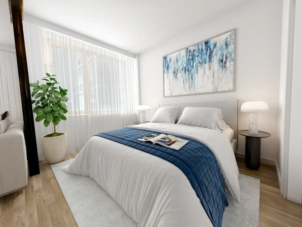 The spacious living and dining area is bathed in natural light through expansive east-facing windows, with a tranquil bedroom that easily accommodates a queen-sized bed. A generous custom closet offers ample storage, with an additional space ideal for a second closet or built-in dressing area. The spa-inspired bathroom boasts an oversized soaking tub, modern finishes, and a luxurious rainfall showerhead-your private retreat at the end of the day.
