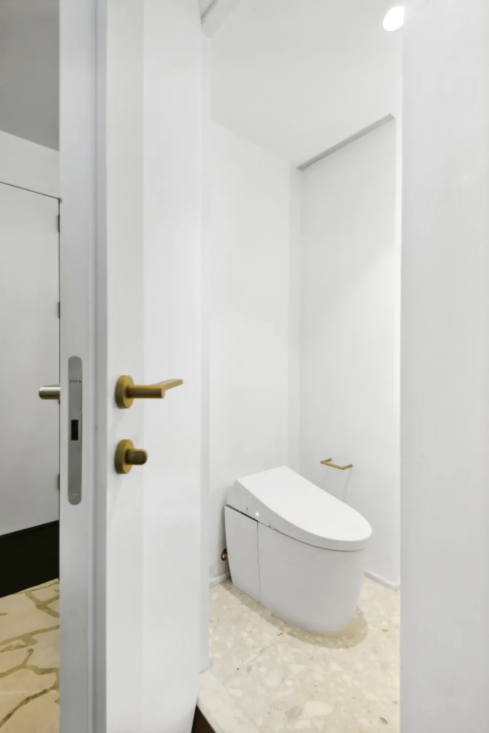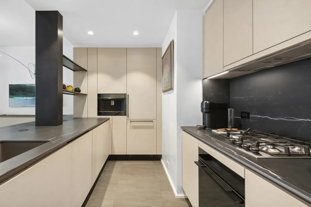 The doors are soundproof and imported from Germany, with sash hinges and Valli & Valli hardware from Italy. All bathroom fixtures are by Fantini, also imported from Italy. The kitchen and bathroom floors and tile are by Ann Sacks, with matching stone finishes. The kitchen features a sleek Arclinea design with real honed marble countertops, Fisher & Paykel appliances, and a Sub-Zero refrigerator.