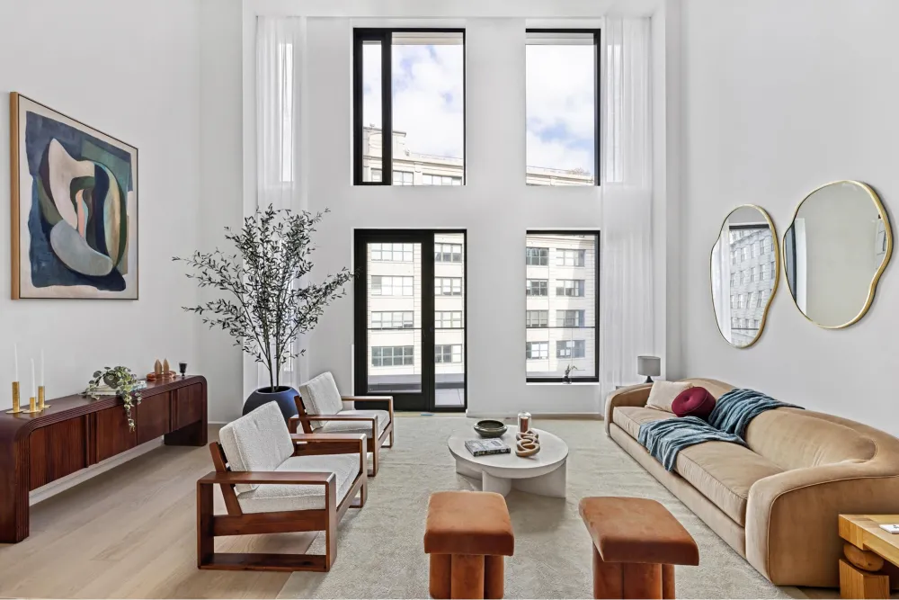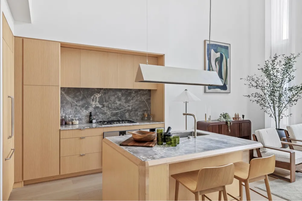 Introducing Duplex Residence 10B, featuring ceilings soaring up to 18', two bedrooms, and two-and-a-half bathrooms. Upon entry, the double-height foyer introduces the grand light-filled living space. The impeccably tailored Workstead-designed kitchen merges exquisite detail with rich materials. Featuring a statement kitchen island with inlaid Fior di Bosco stone slab and chamfered edges, raked maple cabinetry and millwork paired with satin nickel hardware and top-of-the-line Gaggenau appliances, the kitchen proves an integral part of the generous open living and dining area with oversized windows that look on to the private terrace.