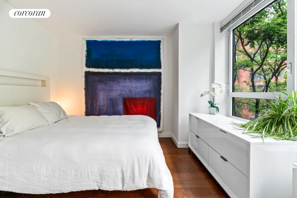 Bathed in morning light, this thoughtfully designed home features oversized windows that frame picturesque views of the building's lush, tree-filled private courtyard-an exclusive half-acre park that serves as a rare urban sanctuary. The quiet exposure ensures a peaceful ambiance throughout the day.