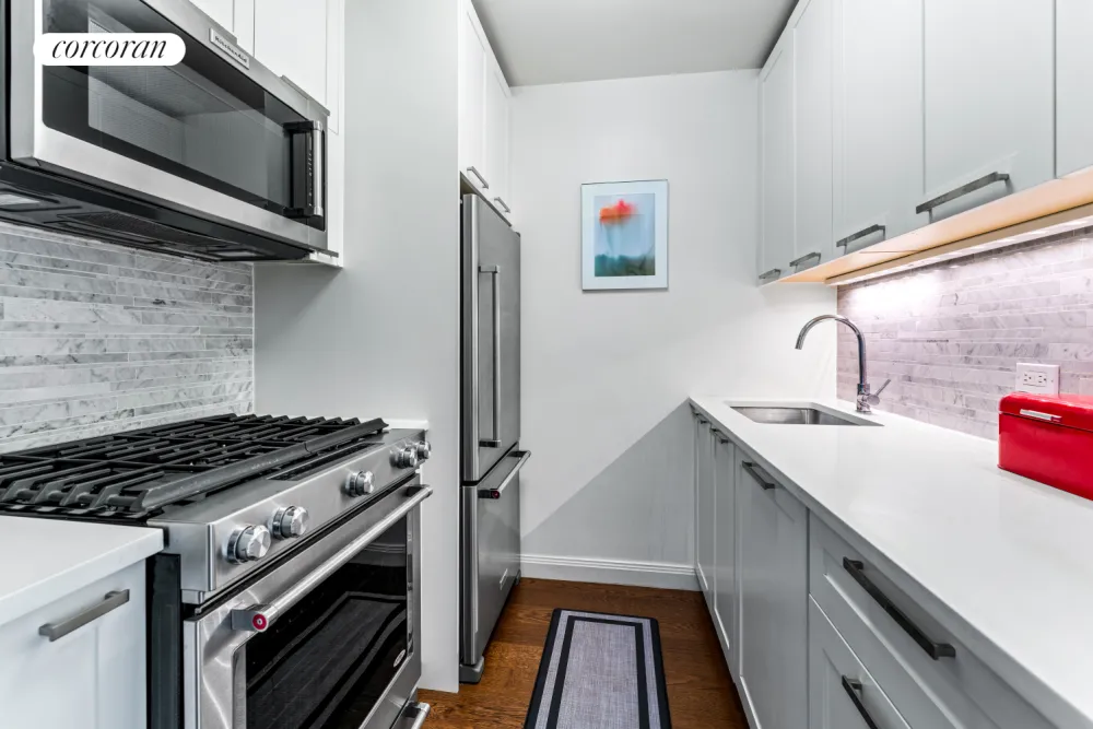 Just off the main living area, the renovated kitchen is a study in contemporary elegance and efficiency. Outfitted with premium KitchenAid stainless steel appliances-including a 5-burner gas range, dishwasher, and built-in microwave-it also features Caesarstone countertops, a deep under-mount sink, soft-close cabinetry, and a marble mosaic backsplash. Under-cabinet lighting adds a touch of refinement and enhances both functionality and atmosphere.