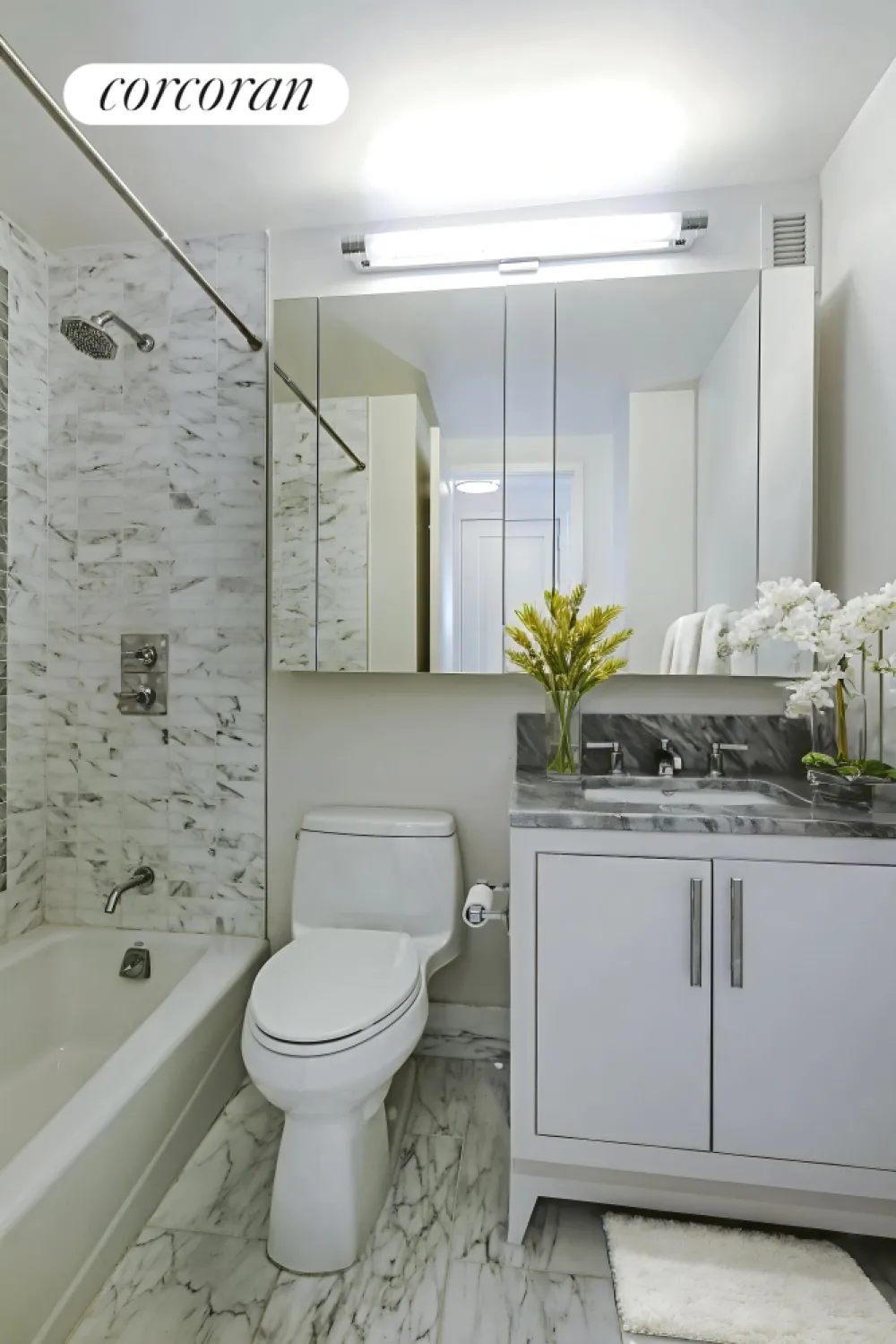 The spa-inspired bathroom is finished with Caldia marble floors, a modern vanity with under-sink storage, and a mirrored medicine cabinet that conceals additional shelving-creating a clean, elevated aesthetic while maximizing utility.