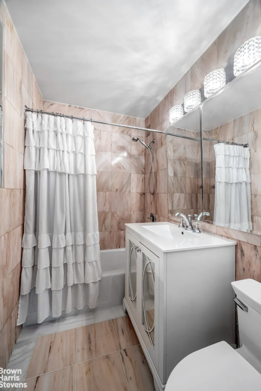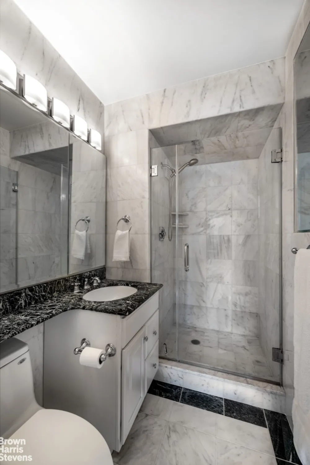 Both bedrooms are generously proportioned with ample closet space, while the primary suite boasts a luxurious layout with dual closets and a serene, marble-clad en-suite bathroom with a stall shower. The second full bath features elegant marble finishes and a soaking tub.