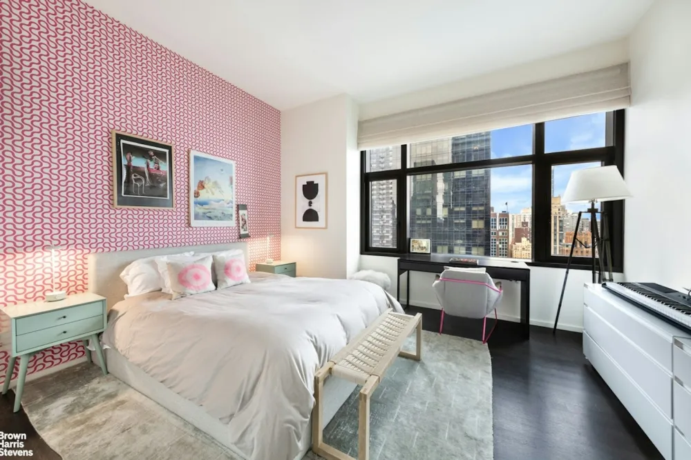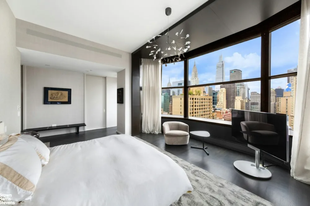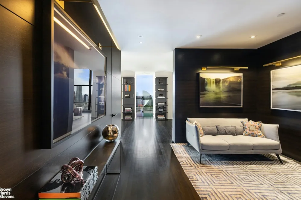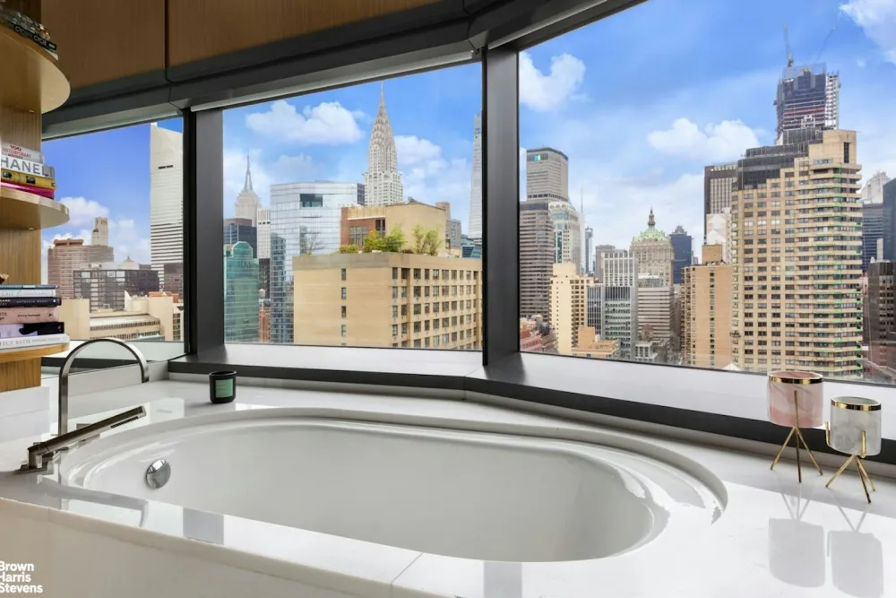 A luxurious custom designed 3 bedroom condo with sweeping views of the river and skyline. Fit for the pages of Architectural Digest, this apartment was updated with beautiful dark wood paneling and matching hardwood floors. A sense of elegance is conveyed throughout from antique bronze art lighting to the automatic drapery. The expansive living room with 11'3" ceilings flows seamlessly into a formal dining room with an abundance of light. Poliform white laquer cabinetry adorns the chefs kitchen with granite countertops, a large center island and top of the line appliances. The two secondary bedrooms have en-suite bathrooms and ample closet space. In the hallway you enter through a formal foyer, there is a lovely powder room for guests and laundry room with sink. The primary suite is a vast oasis on to itself with a floor to ceiling bay window and two walk in closets. Spectacular views of the Empire State and Chrysler buildings from both the bedroom and the zen like primary bath with Zivec white marble floors, soaking tub, separate walk in shower, bidet, Dornbracht fixtures, radiant heated floors and a gorgeous dual sink vanity designed by Foster and Partners.