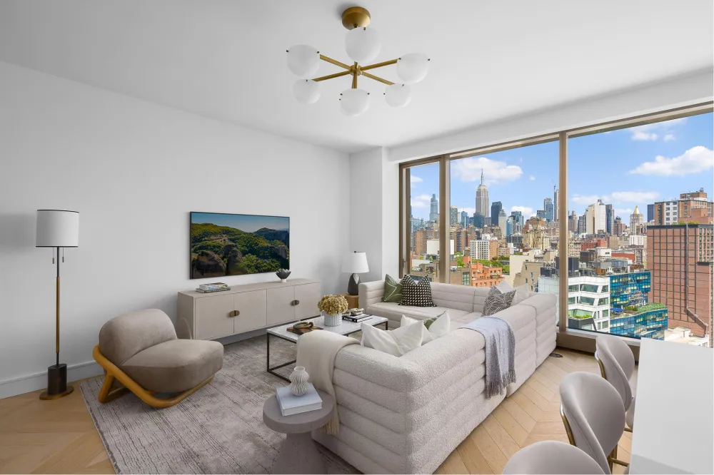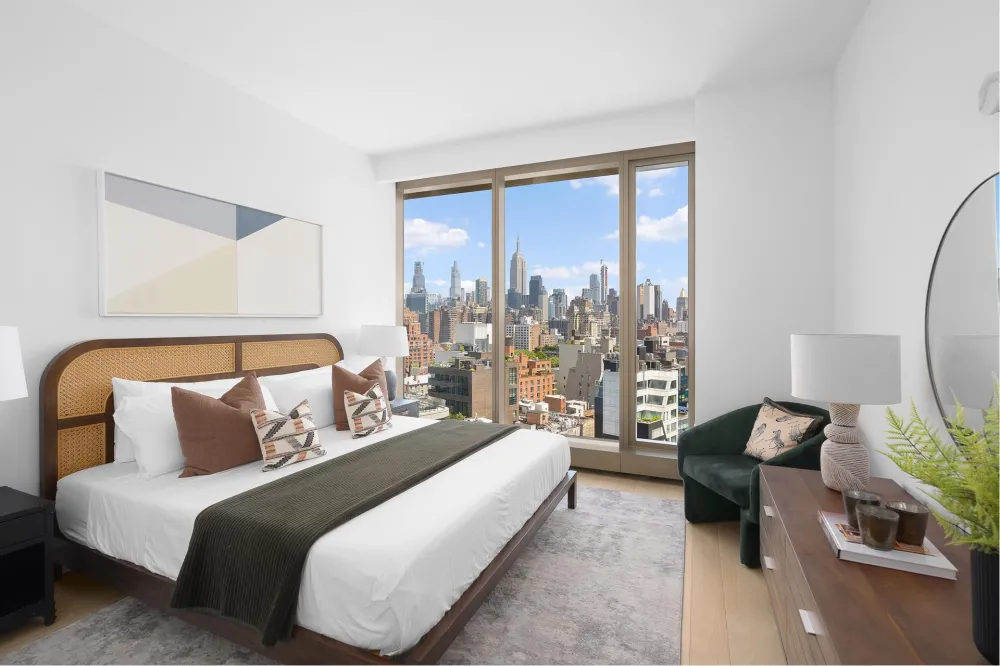 Residence East-15E is a luminous 1,512-square-foot two-bedroom, two-and-a-half-bathroom home offering sweeping eastern skyline views through walls of floor-to-ceiling glass. Designed with elegance and livability in mind, this sophisticated layout centers around a sun-filled great room with natural oak chevron flooring and a seamless connection to the chef's kitchen-an entertainer's dream.