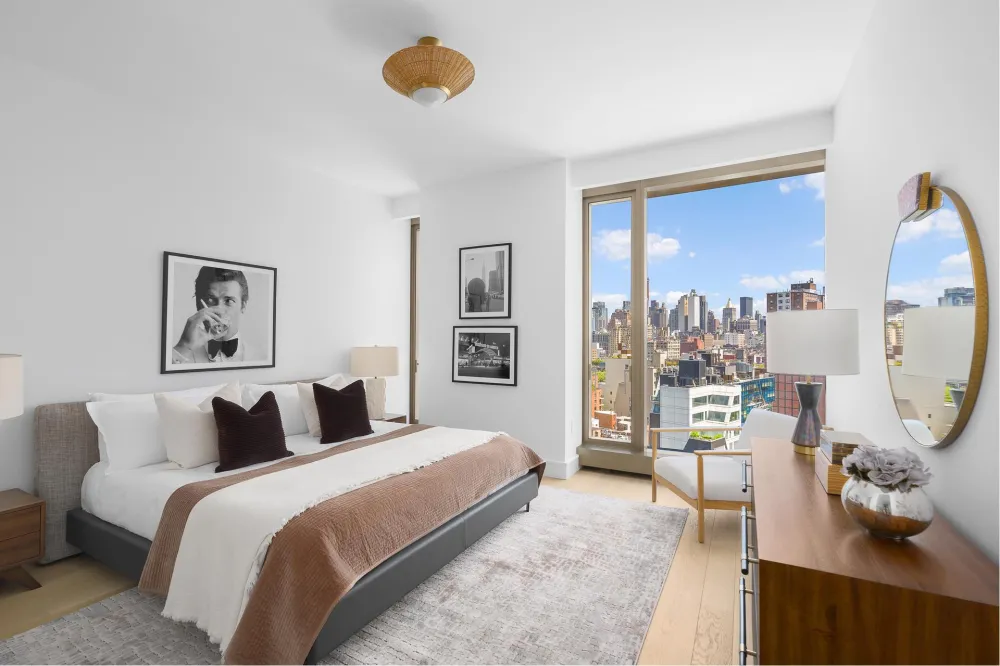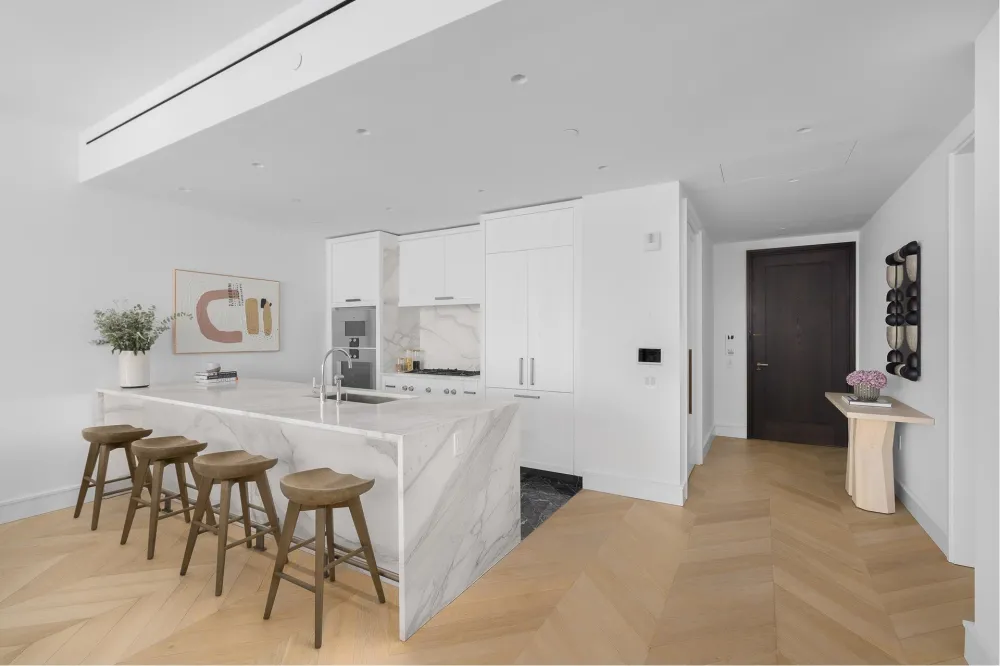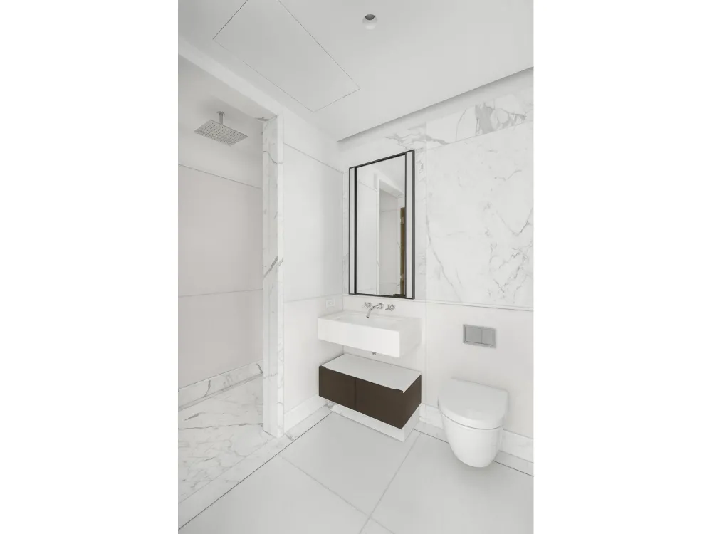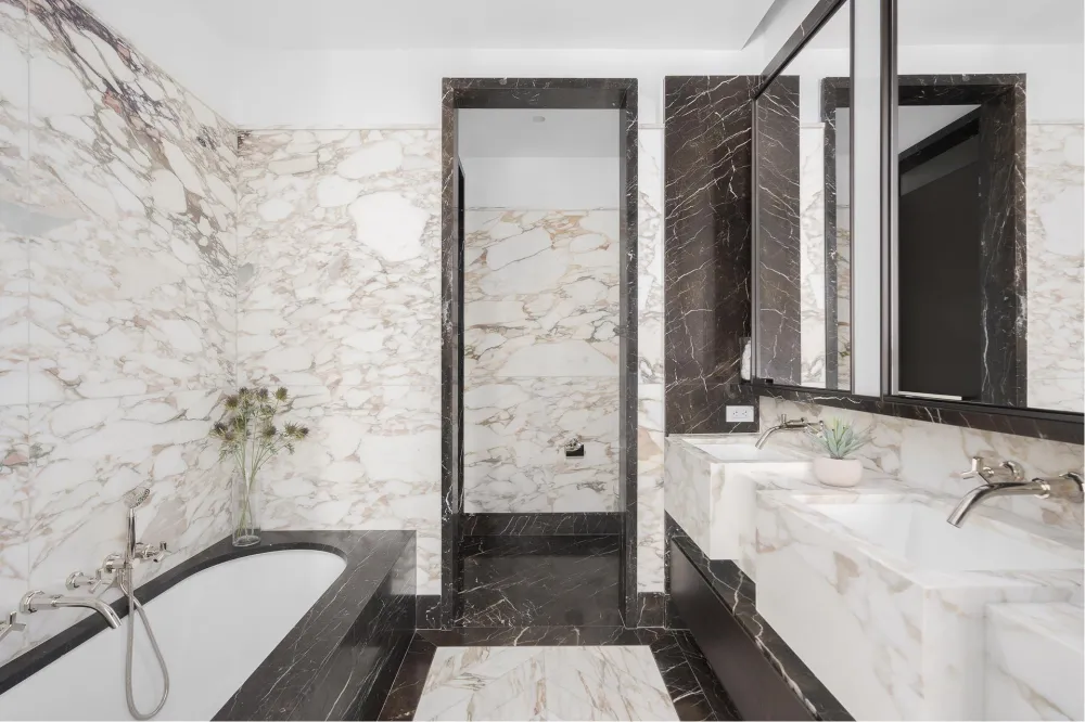 The gracious primary suite offers stunning city vistas, and a spa-quality bath clad in Arabescato Vagli Oro and Saint Laurent marbles. A Kaldewei soaking tub, radiant-heated floors, integrated LED lighting, and smoked oak vanities provide a serene, hotel-like experience.